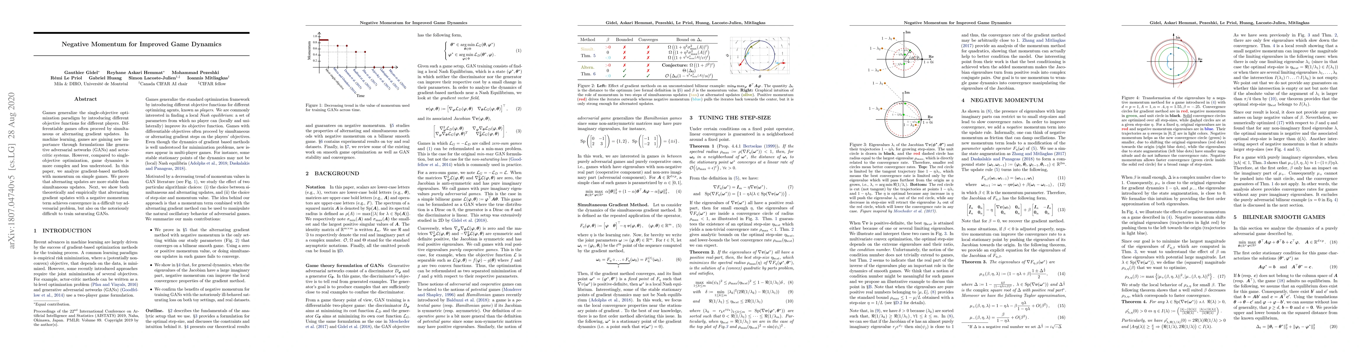 Games generalize the single-objective optimization paradigm by introducing different objective functions for different players. Differentiable games often proceed by simultaneous or alternating gradient updates. In machine learning, games are gaining new importance through formulations like generative adversarial networks (GANs) and actor-critic systems. However, compared to single-objective optimization, game dynamics are more complex and less understood. In this paper, we analyze gradient-based methods with momentum on simple games. We prove that alternating updates are more stable than simultaneous updates. Next, we show both theoretically and empirically that alternating gradient updates with a negative momentum term achieves convergence in a difficult toy adversarial problem, but also on the notoriously difficult to train saturating GANs.