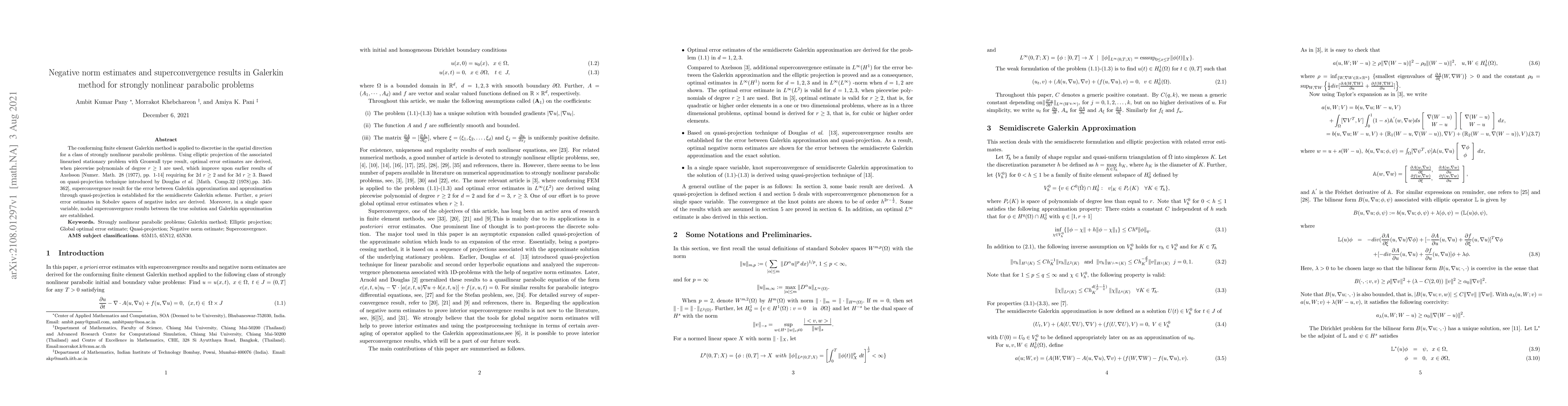 This paper presents optimal error estimates for the conforming finite element Galerkin method applied to strongly nonlinear parabolic problems, improving upon earlier results. It also establishes superconvergence results and derives {\it a priori} error estimates in Sobolev spaces of negative index.