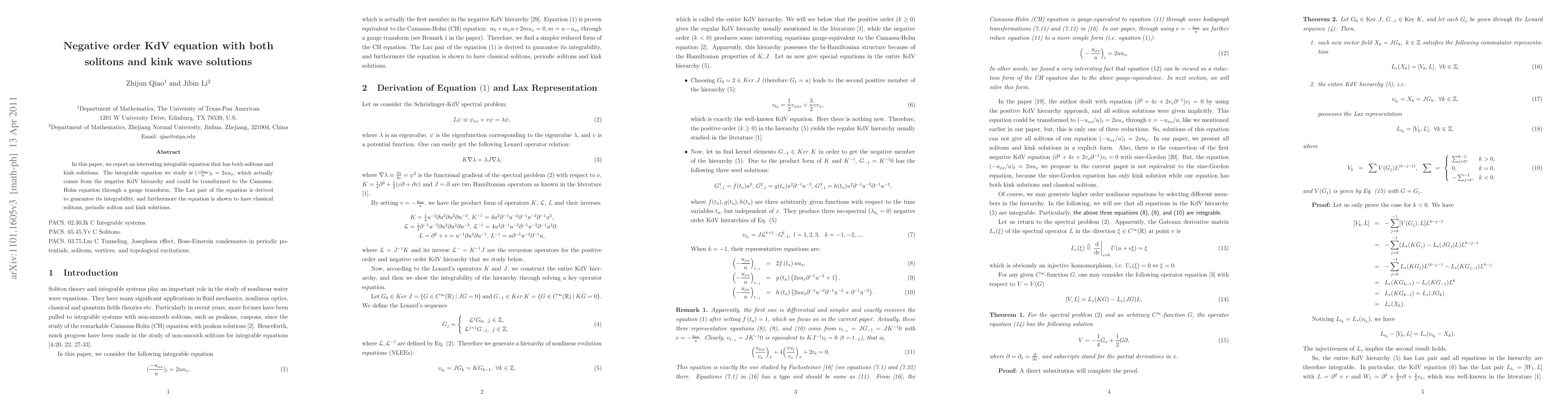 In this paper, we report an interesting integrable equation that has both solitons and kink solutions. The integrable equation we study is $(\frac{-u_{xx}}{u})_{t}=2uu_{x}$, which actually comes from the negative KdV hierarchy and could be transformed to the Camassa-Holm equation through a gauge transform. The Lax pair of the equation is derived to guarantee its integrability, and furthermore the equation is shown to have classical solitons, periodic soliton and kink solutions.