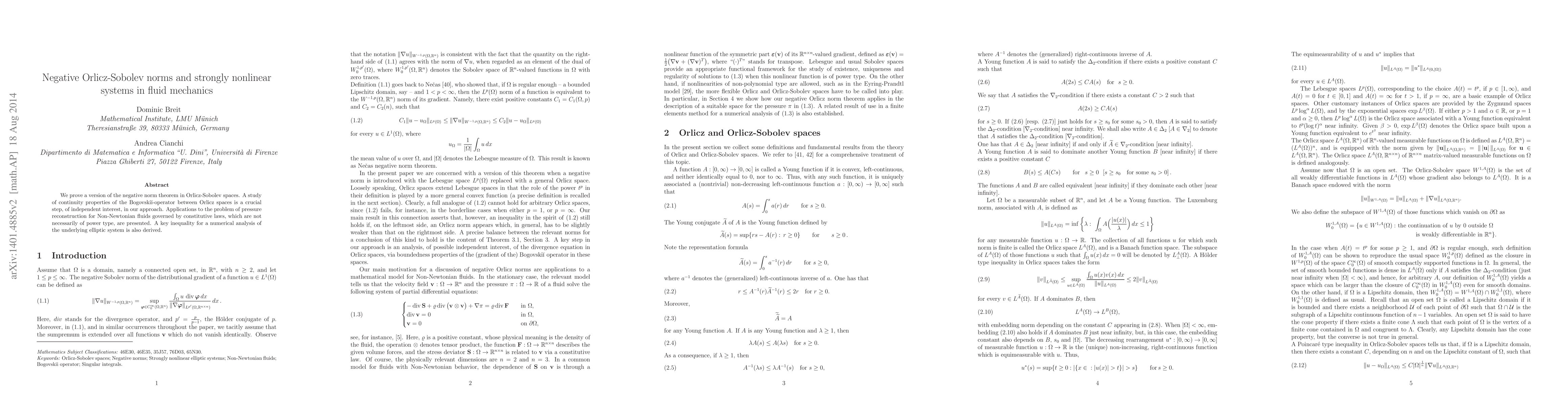 We prove a version of the negative norm theorem in Orlicz-Sobolev spaces. A study of continuity properties of the Bogovskii -operator between Orlicz spaces is a crucial step, of independent interest, in our approach. Applications to the problem of pressure reconstruction for Non-Newtonian fluids governed by constitutive laws, which are not necessarily power type, are presented. A key inequality for a numerical analysis of the underlying elliptic system is also derived.