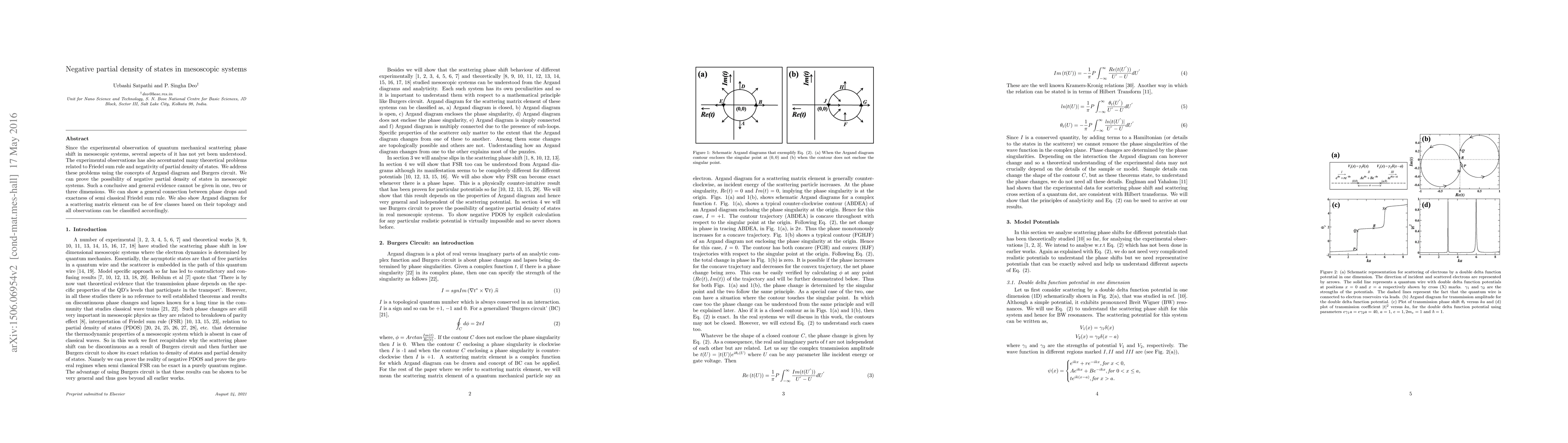 This paper explores the theoretical underpinnings of negative partial density of states in mesoscopic systems, proving its possibility using Argand diagram and Burgers circuit concepts. It establishes a connection between phase drops and the Friedel sum rule, classifying scattering matrix elements based on their topological properties.