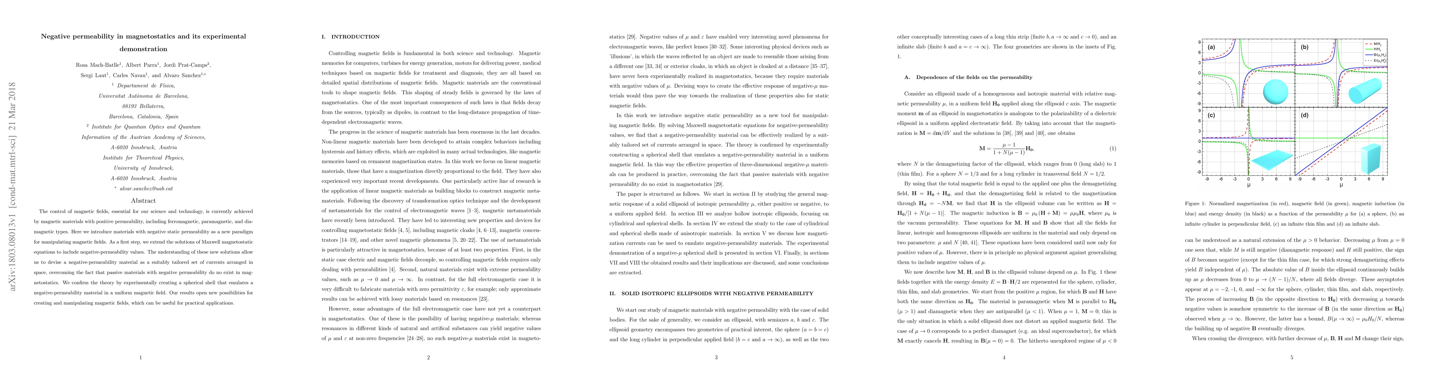 This paper introduces negative static permeability as a novel concept for magnetic field manipulation, extending Maxwell's equations to include negative values. Experimentally, it demonstrates a spherical shell emulating such a material, paving the way for new magnetic field control techniques.