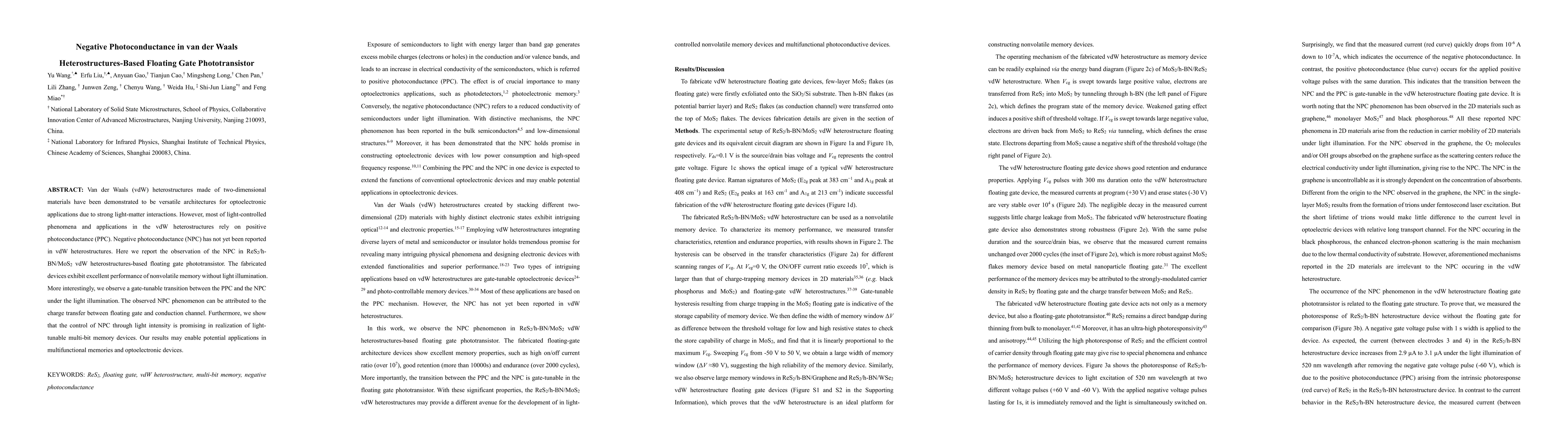 This paper reports the first observation of negative photoconductance (NPC) in van der Waals heterostructures, specifically in ReS2/h-BN/MoS2 floating gate phototransistors. The devices exhibit nonvolatile memory performance and a gate-tunable transition between positive and negative photoconductance under light, suggesting potential for light-tunable multi-bit memory applications.