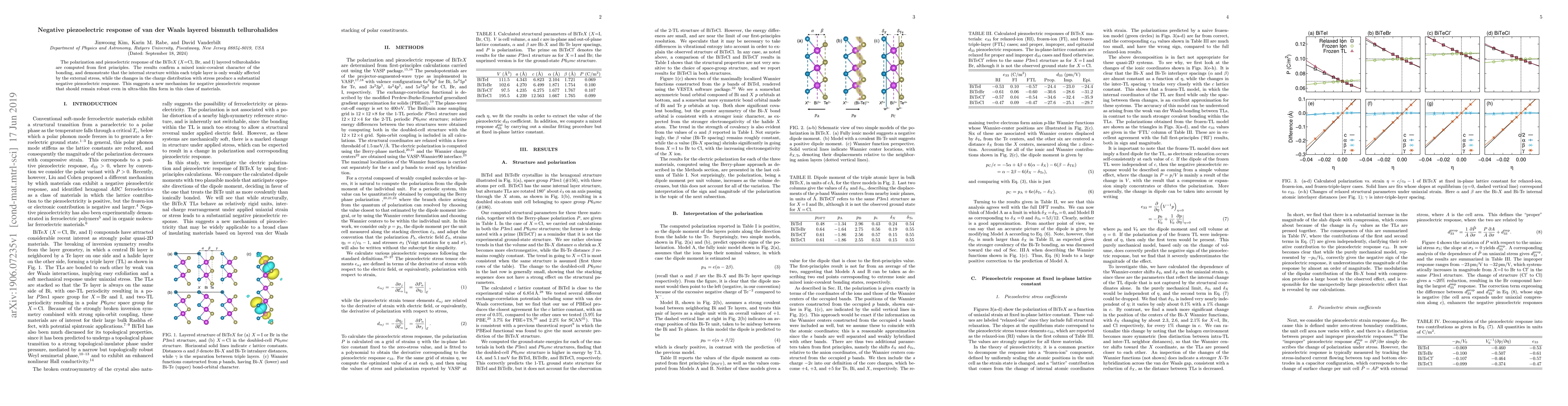 Researchers found that certain layered bismuth tellurohalides exhibit a negative piezoelectric response due to changes in charge distribution with external stress, suggesting a new mechanism for negative piezoelectric behavior in ultra-thin films.