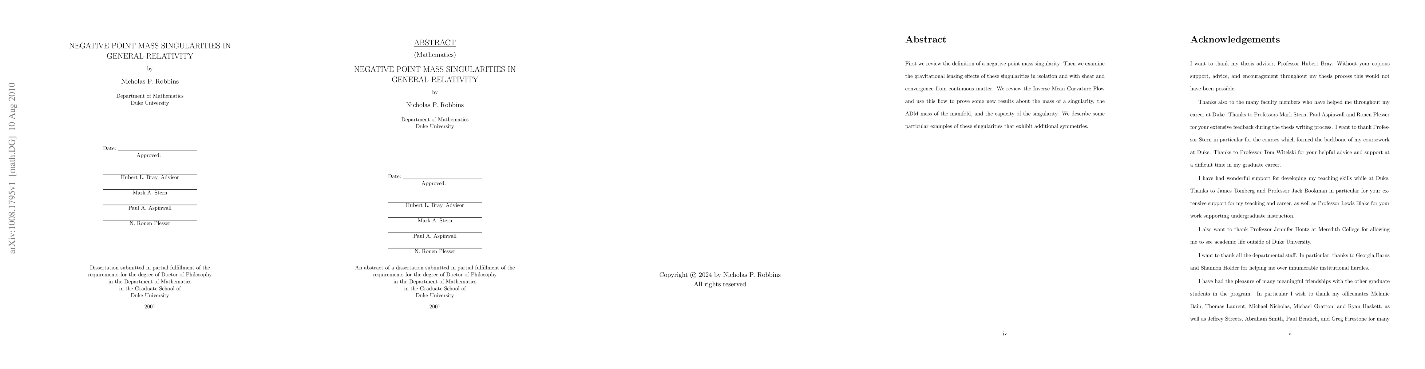 First we review the definition of a negative point mass singularity. Then we examine the gravitational lensing effects of these singularities in isolation and with shear and convergence from continuous matter. We review the Inverse Mean Curvature Flow and use this flow to prove some new results about the mass of a singularity, the ADM mass of the manifold, and the capacity of the singularity. We describe some particular examples of these singularities that exhibit additional symmetries.