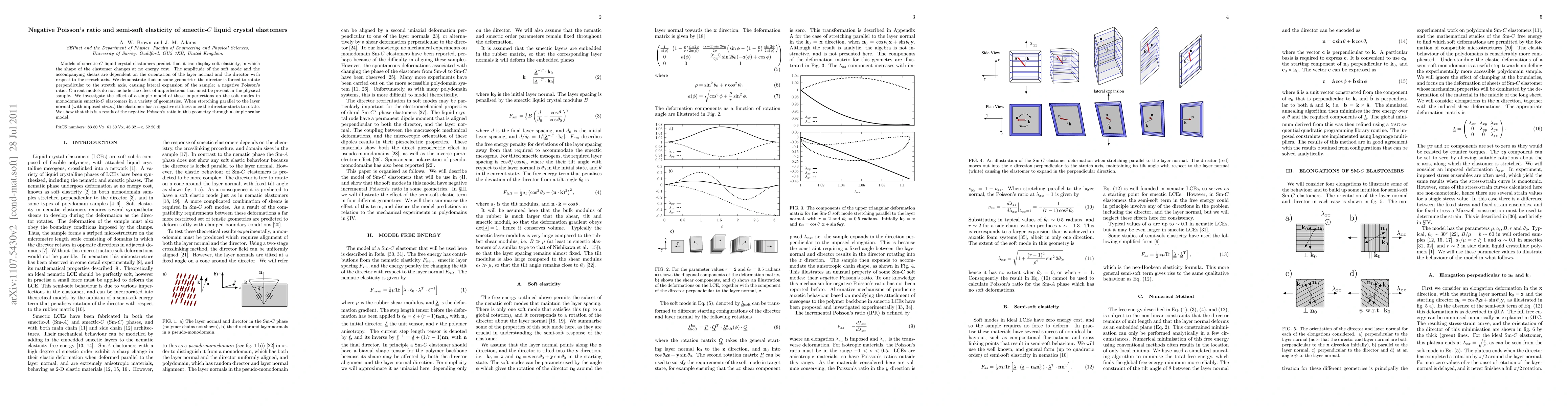 This paper investigates smectic-C liquid crystal elastomers, demonstrating their ability to exhibit negative Poisson's ratio and semi-soft elasticity, where shape changes occur at no energy cost. The study reveals that imperfections in physical samples affect the soft modes, leading to negative stiffness when stretching parallel to the layer normal.