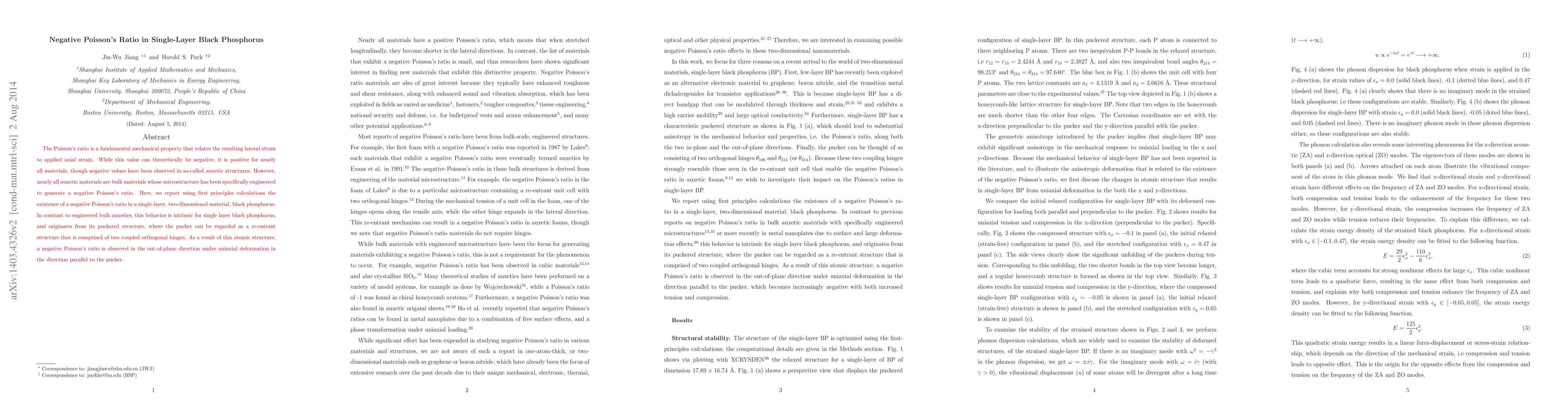 Research paper reports the intrinsic negative Poisson's ratio in single-layer black phosphorus due to its unique, puckered structure. Unlike engineered auxetic materials, this behavior is inherent and arises from coupled orthogonal hinges within the material.