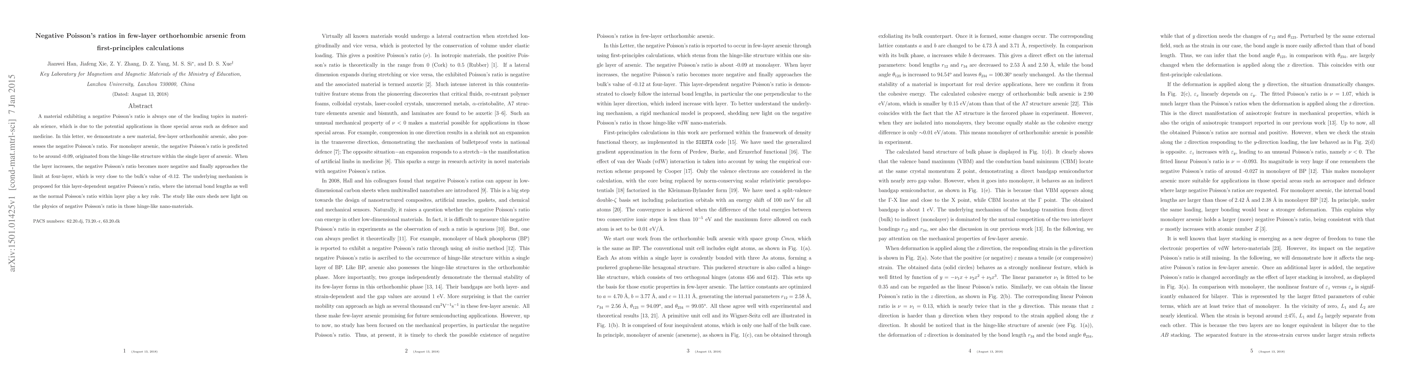 This paper reports the discovery of few-layer orthorhombic arsenic exhibiting a negative Poisson's ratio, a property with potential applications in defense and medicine. The study finds that the negative Poisson's ratio increases with layer number, reaching nearly -0.12 in four layers, and attributes this behavior to hinge-like structures and internal bond lengths.