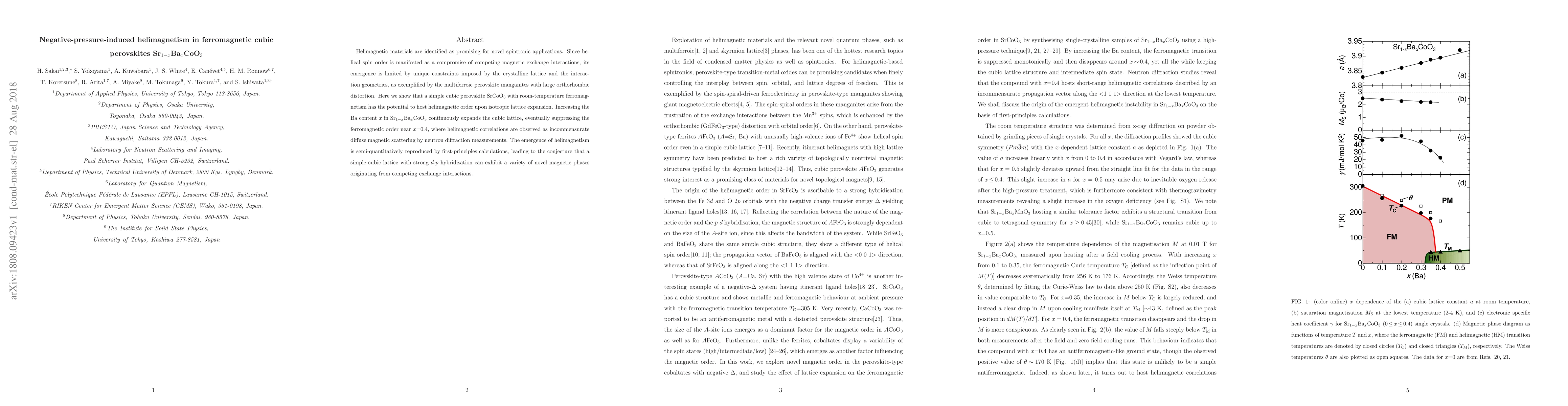 Helimagnetic materials are identified as promising for novel spintronic applications. Since helical spin order is manifested as a compromise of competing magnetic exchange interactions, its emergence is limited by unique constraints imposed by the crystalline lattice and the interaction geometries, as exemplified by the multiferroic perovskite manganites with large orthorhombic distortion. Here we show that a simple cubic perovskite SrCoO$_3$ with room-temperature ferromagnetism has the potential to host helimagnetic order upon isotropic lattice expansion. Increasing the Ba content $x$ in Sr$_{1-x}$Ba$_x$CoO$_3$ continuously expands the cubic lattice, eventually suppressing the ferromagnetic order near $x$=0.4, where helimagnetic correlations are observed as incommensurate diffuse magnetic scattering by neutron diffraction measurements. The emergence of helimagnetism is semi-quantitatively reproduced by first-principles calculations, leading to the conjecture that a simple cubic lattice with strong $d$-$p$ hybridisation can exhibit a variety of novel magnetic phases originating from competing exchange interactions.