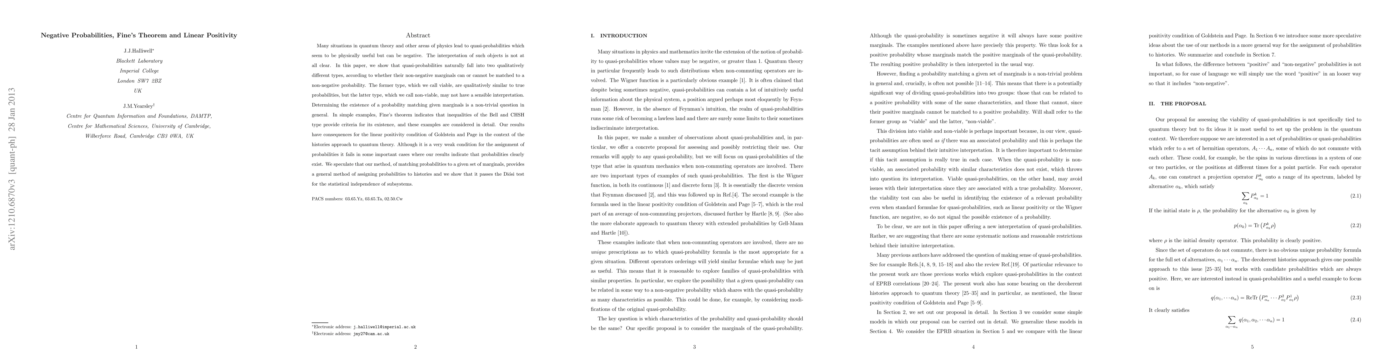 This paper explores the classification of quasi-probabilities in quantum theory, distinguishing between viable and non-viable types based on whether their non-negative marginals can match a non-negative probability. It uses Fine's theorem and Bell inequalities to determine viability and discusses implications for the linear positivity condition in quantum histories.