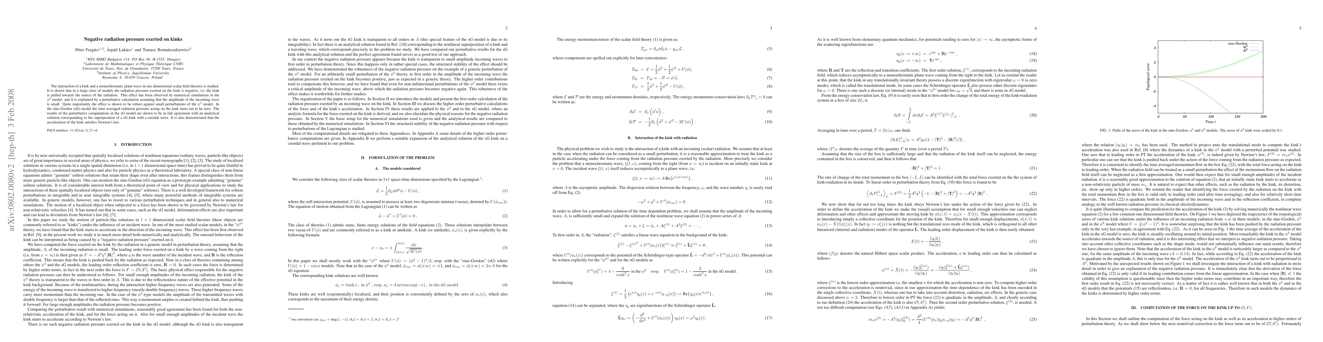 The interaction of a kink and a monochromatic plane wave in one dimensional scalar field theories is studied. It is shown that in a large class of models the radiation pressure exerted on the kink is negative, i.e. the kink is {\sl pulled} towards the source of the radiation. This effect has been observed by numerical simulations in the $\phi^4$ model, and it is explained by a perturbative calculation assuming that the amplitude of the incoming wave is small. Quite importantly the effect is shown to be robust against small perturbations of the $\phi^4$ model. In the sine-Gordon (sG) model the time averaged radiation pressure acting on the kink turns out to be zero. The results of the perturbative computations in the sG model are shown to be in full agreement with an analytical solution corresponding to the superposition of a sG kink with a cnoidal wave. It is also demonstrated that the acceleration of the kink satisfies Newton's law.