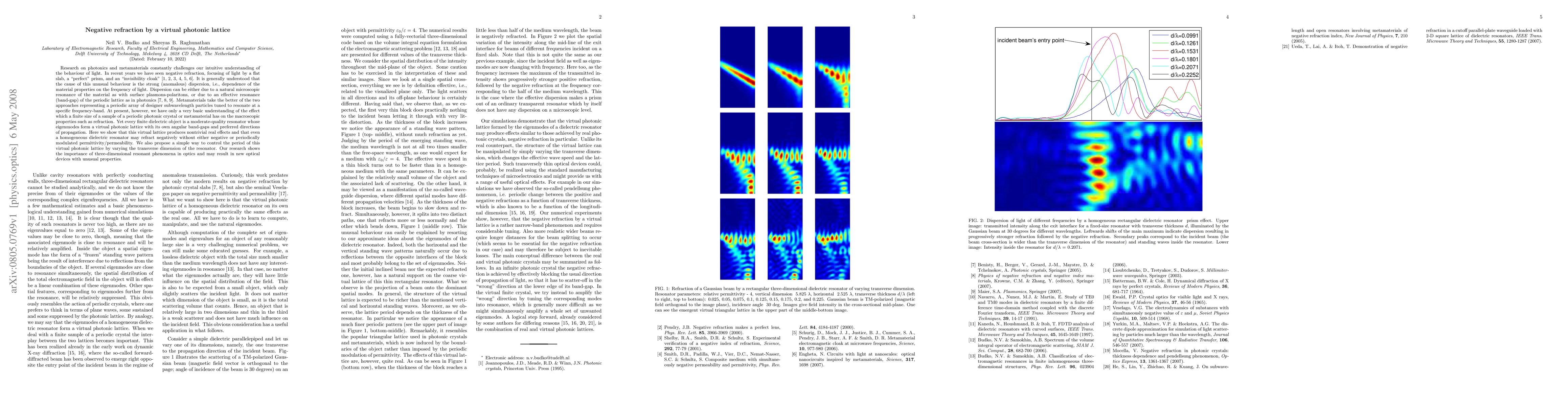 Research on photonics and metamaterials constantly challenges our intuitive understanding of the behaviour of light. In recent years we have seen negative refraction, focusing of light by a flat slab, a ``perfect'' prism, and an ``invisibility cloak'' [1-6]. It is generally understood that the cause of this unusual behaviour is the strong (anomalous) dispersion, i.e., dependence of the material properties on the frequency of light. Dispersion can be either due to a natural microscopic resonance of the material as with surface plasmons-polaritons, or due to an effective resonance (band-gap) of the periodic lattice as in photonics [7-9]. Metamaterials take the better of the two approaches representing a periodic array of designer subwavelength particles tuned to resonate at a specific frequency-band. At present, however, we have only a very basic understanding of the effect which a finite size of a sample of a periodic photonic crystal or metamaterial has on the macroscopic properties such as refraction. Yet every finite dielectric object is a moderate-quality resonator whose eigenmodes form a virtual photonic lattice with its own angular band-gaps and preferred directions of propagation. Here we show that this virtual lattice produces nontrivial real effects and that even a homogeneous dielectric resonator may refract negatively without either negative or periodically modulated permittivity/permeability. We also propose a simple way to control the period of this virtual photonic lattice by varying the transverse dimension of the resonator. Our research shows the importance of three-dimensional resonant phenomena in optics and may result in new optical devices with unusual properties.