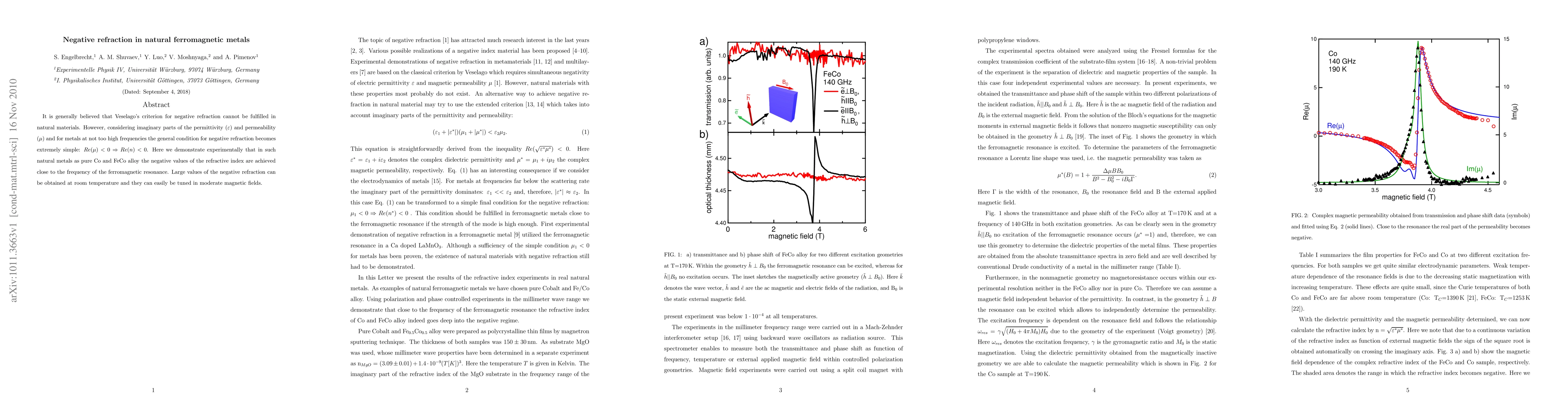 It is generally believed that Veselago's criterion for negative refraction cannot be fulfilled in natural materials. However, considering imaginary parts of the permittivity ({\epsilon}) and permeability ({\mu}) and for metals at not too high frequencies the general condition for negative refraction becomes extremely simple: Re({\mu}) < 0 --> Re(n) < 0. Here we demonstrate experimentally that in such natural metals as pure Co and FeCo alloy the negative values of the refractive index are achieved close to the frequency of the ferromagnetic resonance. Large values of the negative refraction can be obtained at room temperature and they can easily be tuned in moderate magnetic fields.