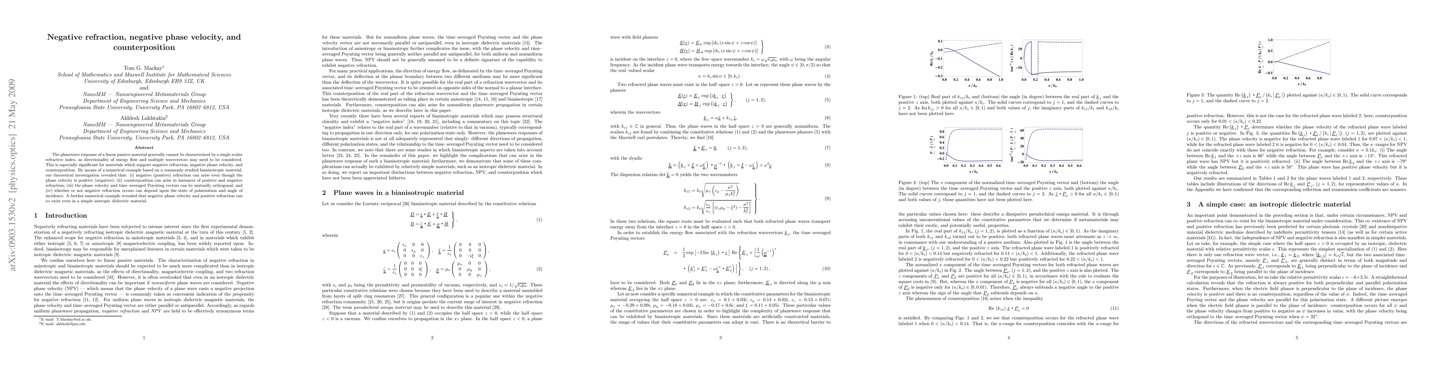 The planewave response of a linear passive material generally cannot be characterized by a single scalar refractive index, as directionality of energy flow and multiple wavevectors may need to be considered. This is especially significant for materials which support negative refraction, negative phase velocity, and counterposition. By means of a numerical example based on a commonly studied bianisotropic material, our theoretical investigation revealed that: (i) negative (positive) refraction can arise even though the phase velocity is positive (negative); (ii) counterposition can arise in instances of positive and negative refraction; (iii) the phase velocity and time-averaged Poynting vectors can be mutually orthogonal; and (iv) whether or not negative refraction occurs can depend upon the state of polarization and angle of incidence. A further numerical example revealed that negative phase velocity and positive refraction can co-exist even in a simple isotropic dielectric material.