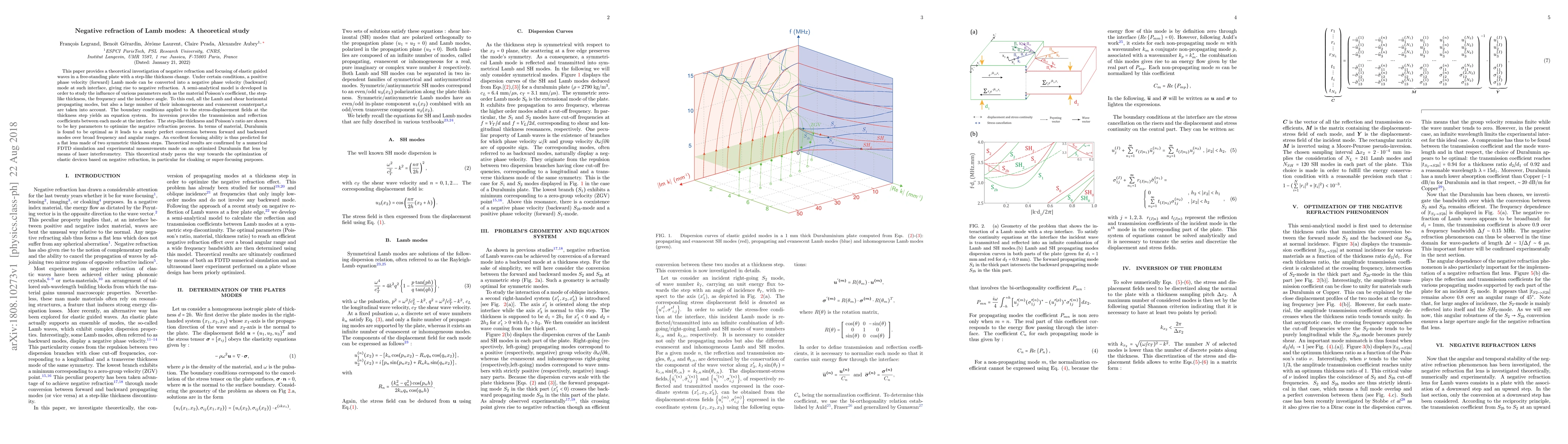 This paper provides a theoretical investigation of negative refraction and focusing of elastic guided waves in a free-standing plate with a step-like thickness change. Under certain conditions, a positive phase velocity (forward) Lamb mode can be converted into a negative phase velocity (backward) mode at such interface, giving rise to negative refraction. A semi-analytical model is developed in order to study the influence of various parameters such as the material Poisson's coefficient, the step-like thickness, the frequency and the incidence angle. To this end, all the Lamb and shear horizontal propagating modes, but also a large number of their inhomogeneous and evanescent counterpart,s are taken into account. The boundary conditions applied to the stress-displacement fields at the thickness step yields an equation system. Its inversion provides the transmission and reflection coefficients between each mode at the interface. The step-like thickness and Poisson's ratio are shown to be key parameters to optimize the negative refraction process. In terms of material, Duralumin is found to be optimal as it leads to a nearly perfect conversion between forward and backward modes over broad frequency and angular ranges. An excellent focusing ability is thus predicted for a flat lens made of two symmetric thickness steps. Theoretical results are confirmed by a numerical FDTD simulation and experimental measurements made on an optimized Duralumin flat lens by means of laser interferometry. This theoretical study paves the way towards the optimization of elastic devices based on negative refraction, in particular for cloaking or super-focusing purposes.