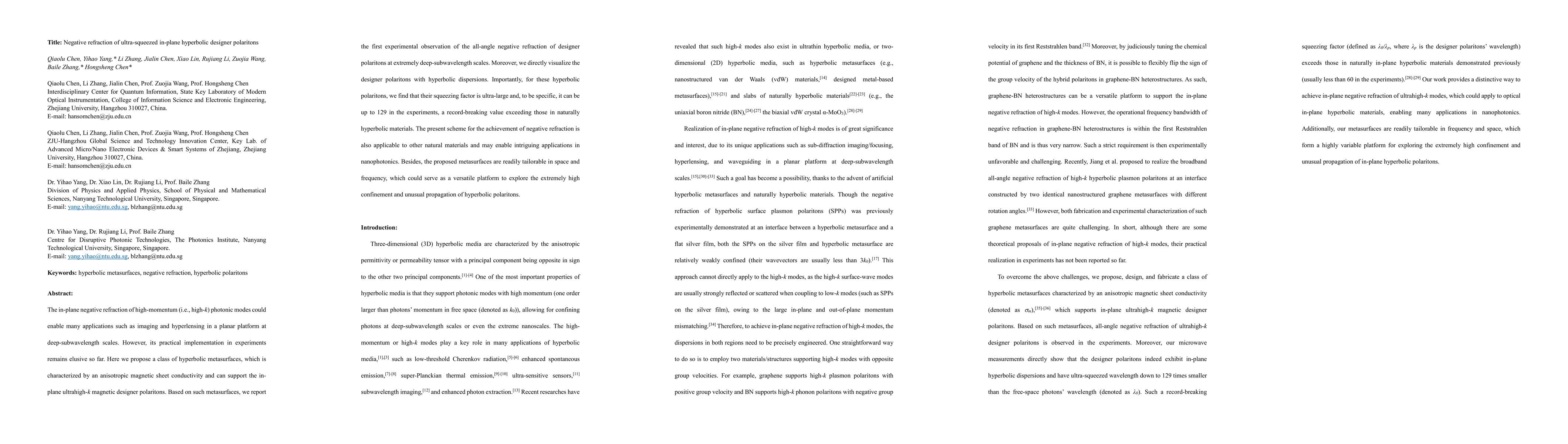 This paper reports the first experimental observation of negative refraction of ultra-squeezed in-plane hyperbolic designer polaritons using anisotropic metasurfaces, achieving a record-breaking squeezing factor of up to 129. The proposed metasurfaces are versatile and may enable applications in nanophotonics and hyperlensing.