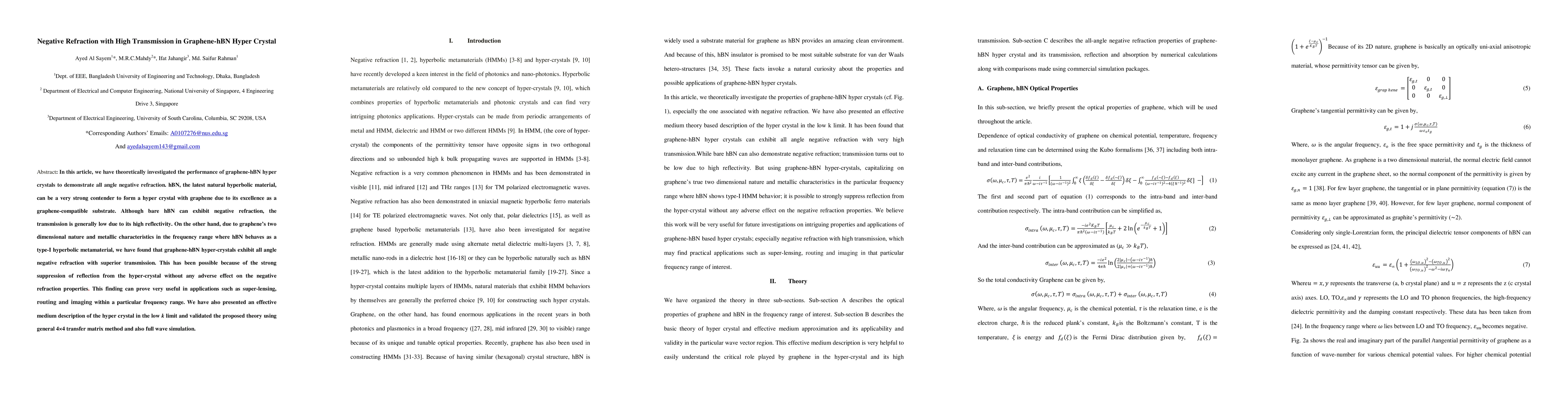 This paper theoretically investigates graphene-hexagonal Boron Nitride hyper crystals, demonstrating all-angle negative refraction with high transmission, overcoming the low transmission issue of hexagonal Boron Nitride. The findings suggest potential applications in superlensing, routing, and imaging.