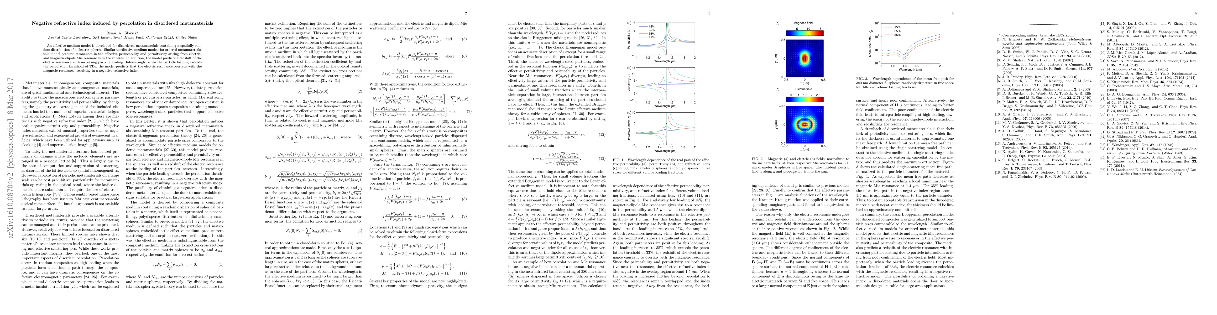 Summary: The study develops an effective medium model for disordered metamaterials with random dielectric spheres, predicting a redshift in electric resonances and a negative refractive index when particle loading exceeds 33% due to resonance overlap post-percolation threshold.