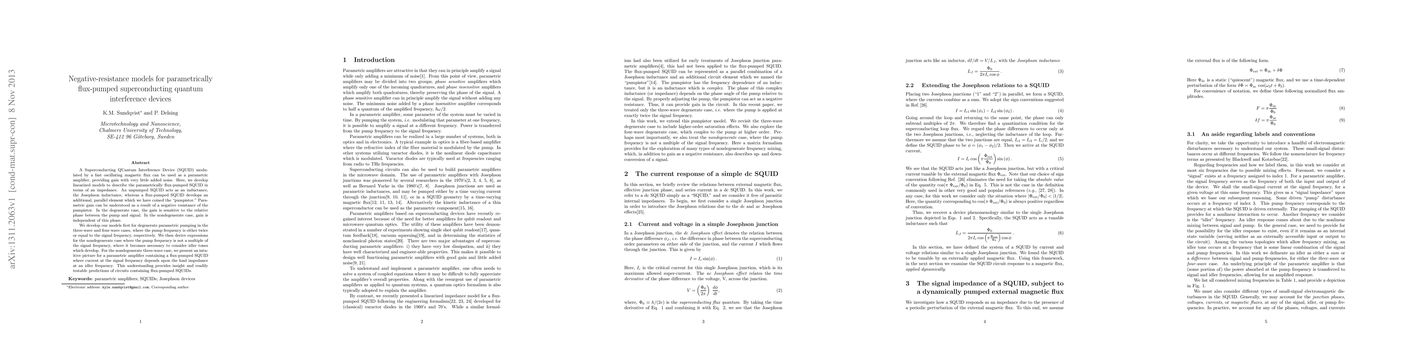 A Superconducting QUantum Interference Device (SQUID) modulated by a fast oscillating magnetic flux can be used as a parametric amplifier, providing gain with very little added noise. Here, we develop linearized models to describe the parametrically flux-pumped SQUID in terms of an impedance. An unpumped SQUID acts as an inductance, the Josephson inductance, whereas a flux-pumped SQUID develops an additional, parallel element which we have coined the ``pumpistor.'' Parametric gain can be understood as a result of a negative resistance of the pumpistor. In the degenerate case, the gain is sensitive to the relative phase between the pump and signal. In the nondegenerate case, gain is independent of this phase. We develop our models first for degenerate parametric pumping in the three-wave and four-wave cases, where the pump frequency is either twice or equal to the signal frequency, respectively. We then derive expressions for the nondegenerate case where the pump frequency is not a multiple of the signal frequency, where it becomes necessary to consider idler tones which develop. For the nondegenerate three-wave case, we present an intuitive picture for a parametric amplifier containing a flux-pumped SQUID where current at the signal frequency depends upon the load impedance at an idler frequency. This understanding provides insight and readily testable predictions of circuits containing flux-pumped SQUIDs.