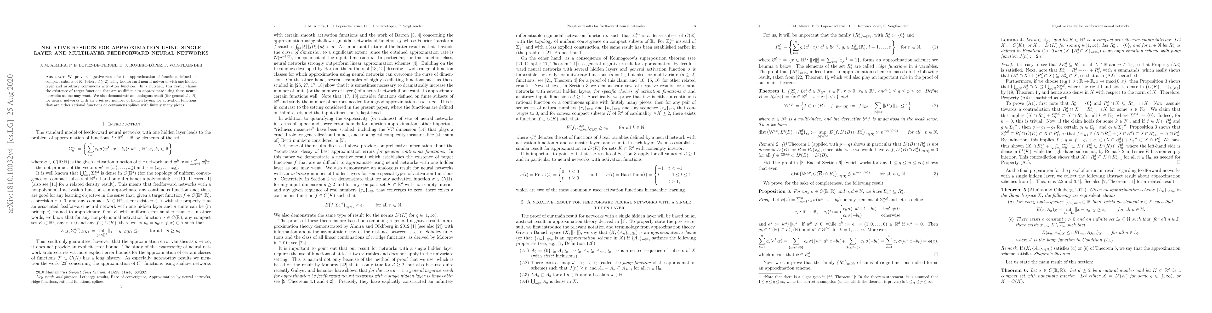 This paper proves that certain functions on compact subsets of $\mathbb{R}^d$ ($d \geq 2$) cannot be well-approximated by single-layer or multilayer feedforward neural networks, regardless of the number of hidden layers or the type of activation function used. This negative result extends to networks with either rational functions or continuous splines as activation functions.