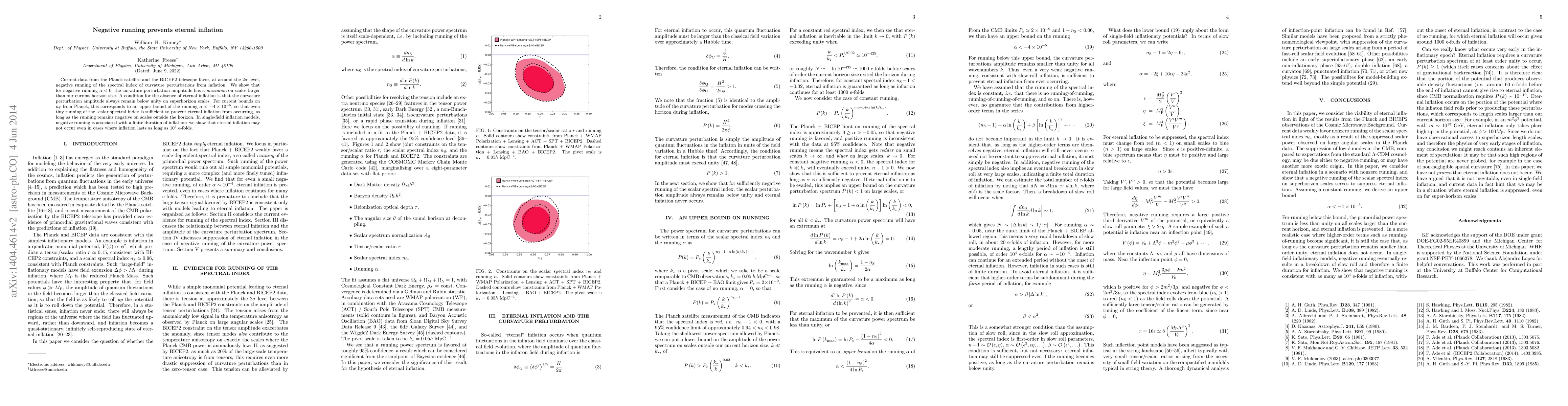 Current data from the Planck satellite and the BICEP2 telescope favor, at around the $2 \sigma$ level, negative running of the spectral index of curvature perturbations from inflation. We show that for negative running $\alpha < 0$, the curvature perturbation amplitude has a maximum on scales larger than our current horizon size. A condition for the absence of eternal inflation is that the curvature perturbation amplitude always remain below unity on superhorizon scales. For current bounds on $n_{\rm S}$ from Planck, this corresponds to an upper bound of the running $\alpha < - 4 \times 10^{-5}$, so that even tiny running of the scalar spectral index is sufficient to prevent eternal inflation from occurring, as long as the running remains negative on scales outside the horizon. In single-field inflation models, negative running is associated with a finite duration of inflation: we show that eternal inflation may not occur even in cases where inflation lasts as long as $10^4$ e-folds.