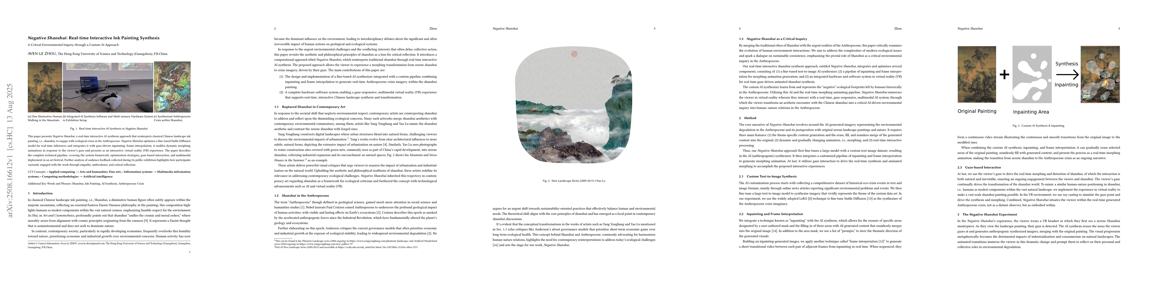This paper presents Negative Shanshui, a real-time interactive AI synthesis approach that reinterprets classical Chinese landscape ink painting, i.e., shanshui, to engage with ecological crises in the Anthropocene. Negative Shanshui optimizes a fine-tuned Stable Diffusion model for real-time inferences and integrates it with gaze-driven inpainting, frame interpolation; it enables dynamic morphing animations in response to the viewer's gaze and presents as an interactive virtual reality (VR) experience. The paper describes the complete technical pipeline, covering the system framework, optimization strategies, gaze-based interaction, and multimodal deployment in an art festival. Further analysis of audience feedback collected during its public exhibition highlights how participants variously engaged with the work through empathy, ambivalence, and critical reflection.