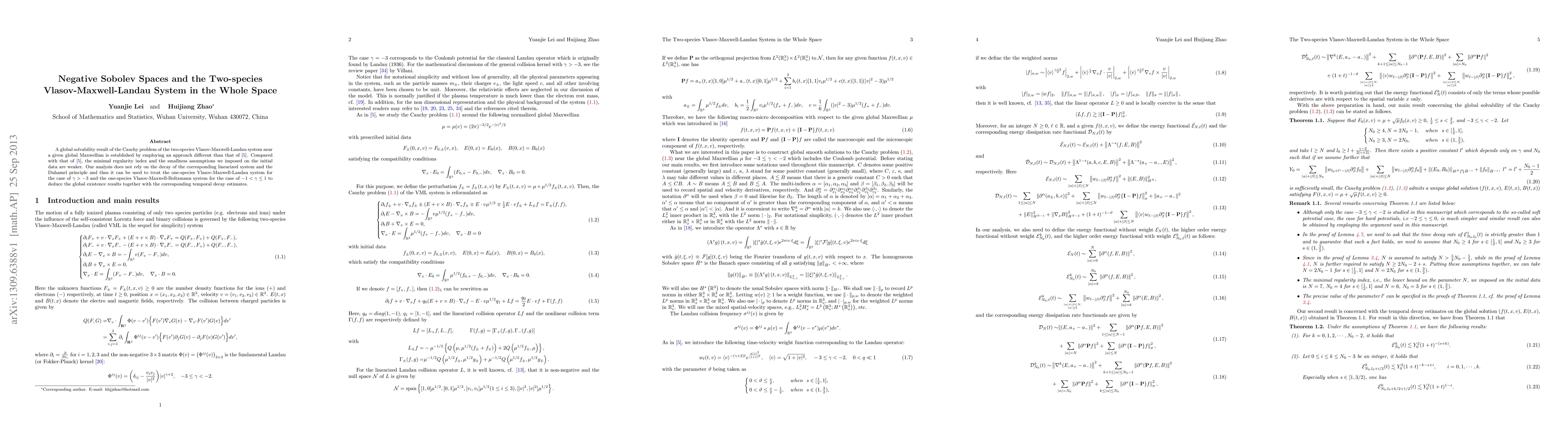 A global solvability result of the Cauchy problem of the two-species Vlasov-Maxwell-Landau system near a given global Maxwellian is established by employing an approach different than that of [5]. Compared with that of [5], the minimal regularity index and the smallness assumptions we imposed on the initial data are weaker. Our analysis does not rely on the decay of the corresponding linearized system and the Duhamel principle and thus it can be used to treat the one-species Vlasov-Maxwell-Landau system for the case of $\gamma>-3$ and the one-species Vlasov-Maxwell-Boltzmann system for the case of $-1<\gamma\leq 1$ to deduce the global existence results together with the corresponding temporal decay estimates.