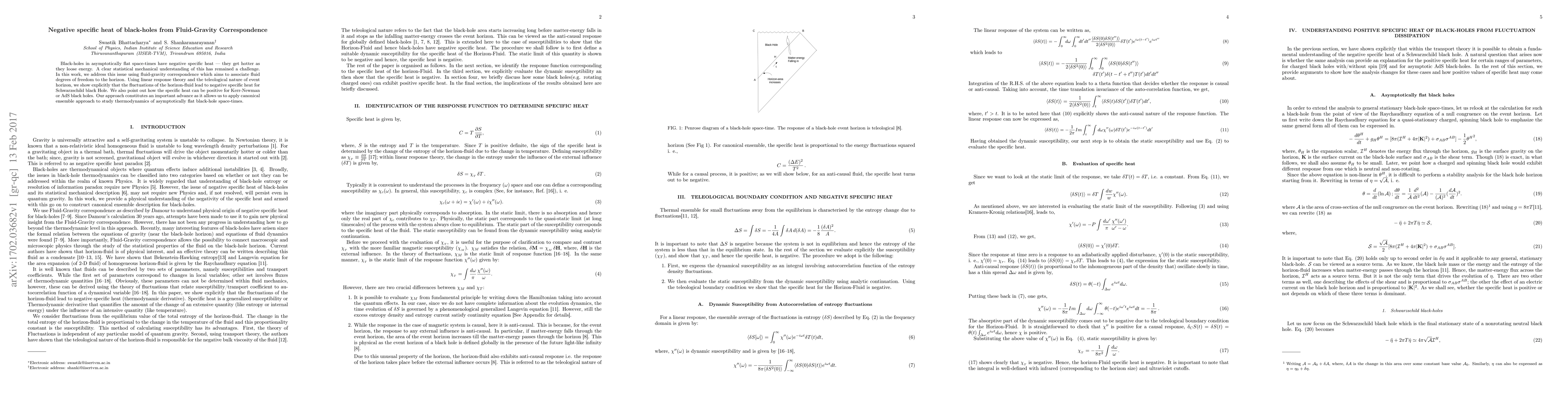 Black-holes in asymptotically flat space-times have negative specific heat --- they get hotter as they loose energy. A clear statistical mechanical understanding of this has remained a challenge. In this work, we address this issue using fluid-gravity correspondence which aims to associate fluid degrees of freedom to the horizon. Using linear response theory and the teleological nature of event horizon, we show explicitly that the fluctuations of the horizon-fluid lead to negative specific heat for Schwarzschild black Hole. We also point out how the specific heat can be positive for Kerr-Newman or AdS black holes. Our approach constitutes an important advance as it allows us to apply canonical ensemble approach to study thermodynamics of asymptotically flat black-hole space-times.