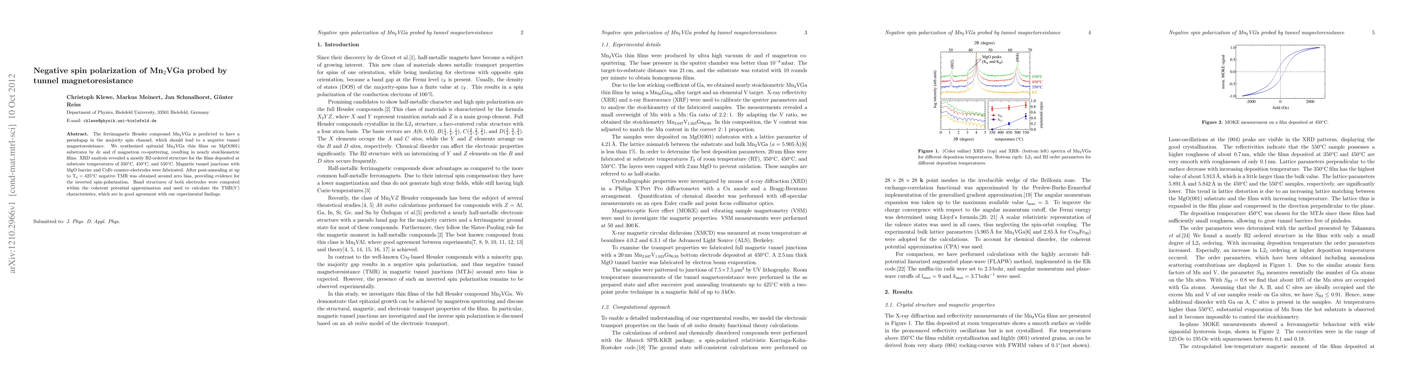 The research paper details the synthesis and characterization of ferrimagnetic Mn2VGa thin films, demonstrating a pseudogap in the majority spin channel leading to negative tunnel magnetoresistance (TMR). Epitaxial films were grown on MgO(001) substrates, confirmed by XRD to have a B2-ordered structure. Magnetic tunnel junctions with MgO barriers and CoFe electrodes were fabricated, showing negative TMR after annealing. Theoretical band structure calculations align with experimental TMR(V) characteristics, supporting the inverted spin-polarization in Mn2VGa.