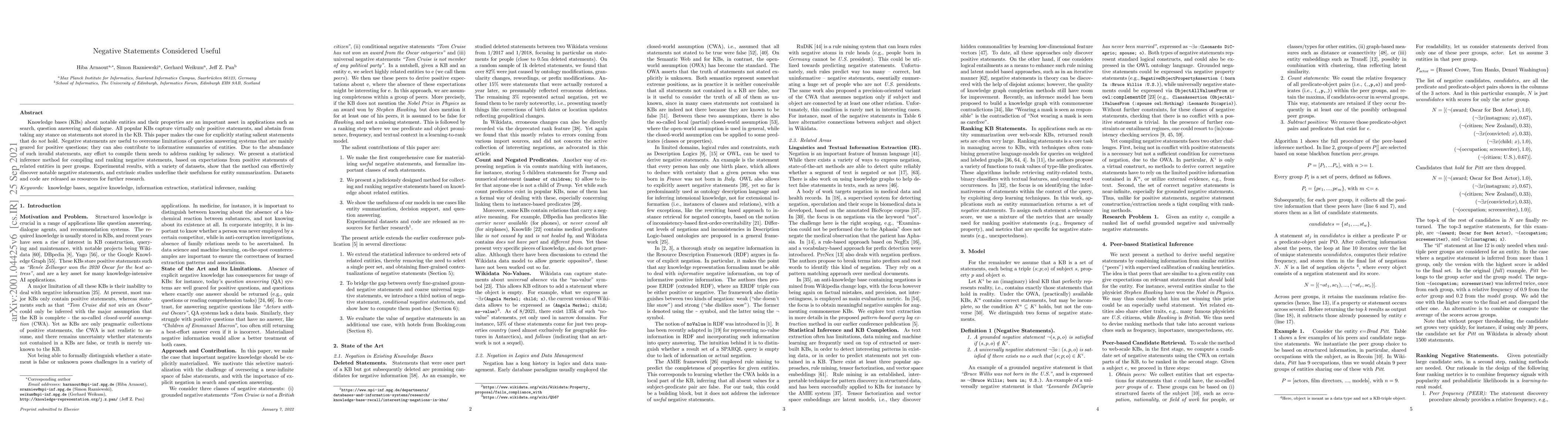 This paper argues for the inclusion of negative statements in knowledge bases to improve question answering and entity summarization, presenting a statistical inference method to rank salient negative statements based on positive statements of related entities. Experimental results demonstrate the effectiveness of the method in discovering notable negative statements.