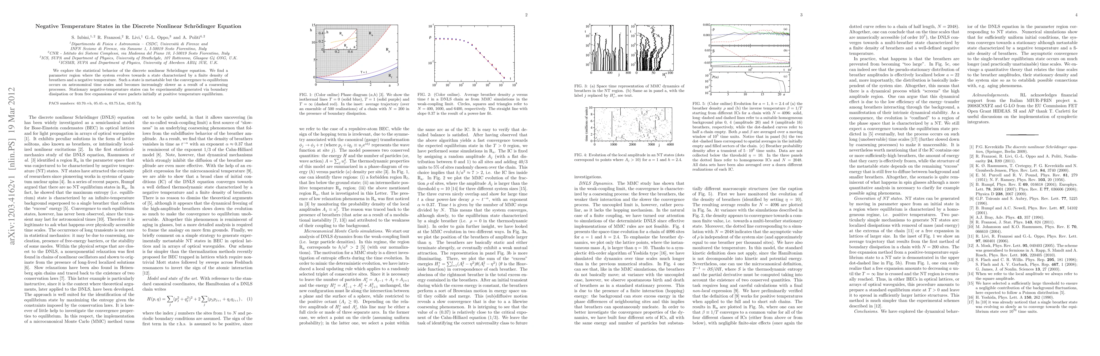 This paper investigates the statistical behavior of the discrete nonlinear Schrödinger equation, revealing a parameter region where the system evolves towards a metastable state with a finite density of breathers and negative temperature, with equilibrium convergence occurring on astronomical timescales due to coarsening processes. Such negative-temperature states can be experimentally induced via boundary dissipation or free expansions of wave packets.