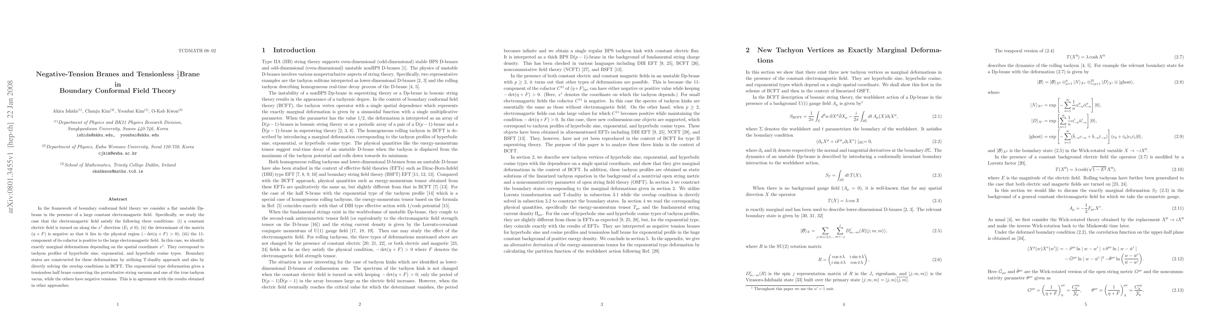 In the framework of boundary conformal field theory we consider a flat unstable D$p$-brane in the presence of a large constant electromagnetic field. Specifically, we study the case that the electromagnetic field satisfy the following three conditions: (i) a constant electric field is turned on along the $x^1$ direction ($E_{1}\ne 0$); (ii) the determinant of the matrix $(\eta + F)$ is negative so that it lies in the physical region ($-\det (\eta + F)>0$); (iii) the 11-component of its cofactor is positive to the large electromagnetic field. In this case, we identify exactly marginal deformations depending on the spatial coordinate $x^1$. They correspond to tachyon profiles of hyperbolic sine, exponential, and hyperbolic cosine types. Boundary states are constructed for these deformations by utilizing T-duality approach and also by directly solving the overlap conditions in BCFT. The exponential type deformation gives a tensionless half brane connecting the perturbative string vacuum and one of the true tachyon vacua, while the others have negative tensions. This is in agreement with the results obtained in other approaches.