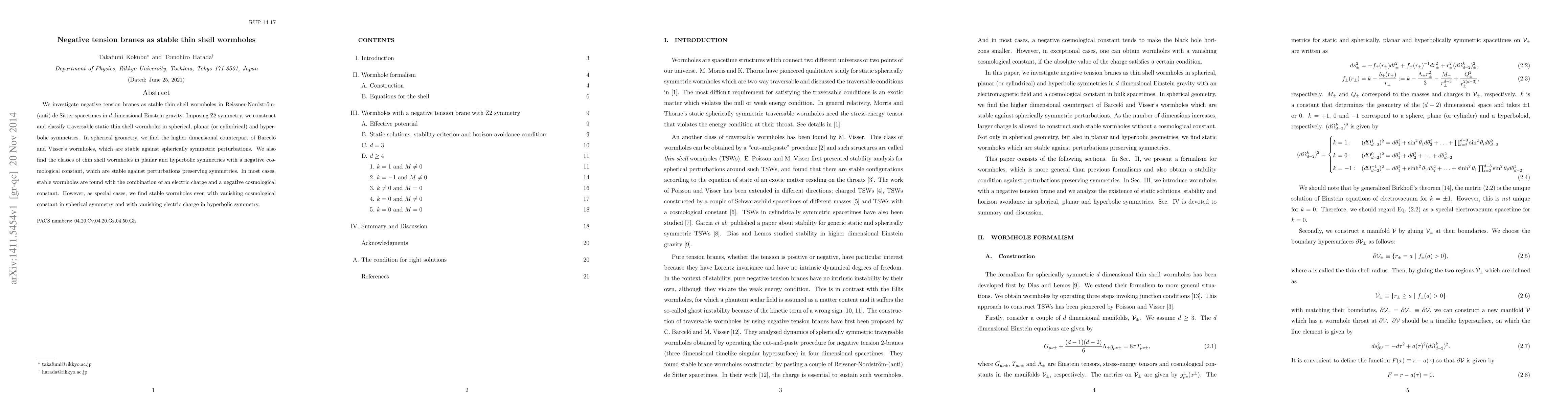 This paper studies negative tension branes in $d$ dimensional Einstein gravity, classifying stable thin shell wormholes in various spacetime symmetries. It finds spherical wormholes stable against perturbations, along with planar and hyperbolic wormholes stable under respective symmetry-preserving perturbations, often requiring an electric charge and negative cosmological constant.