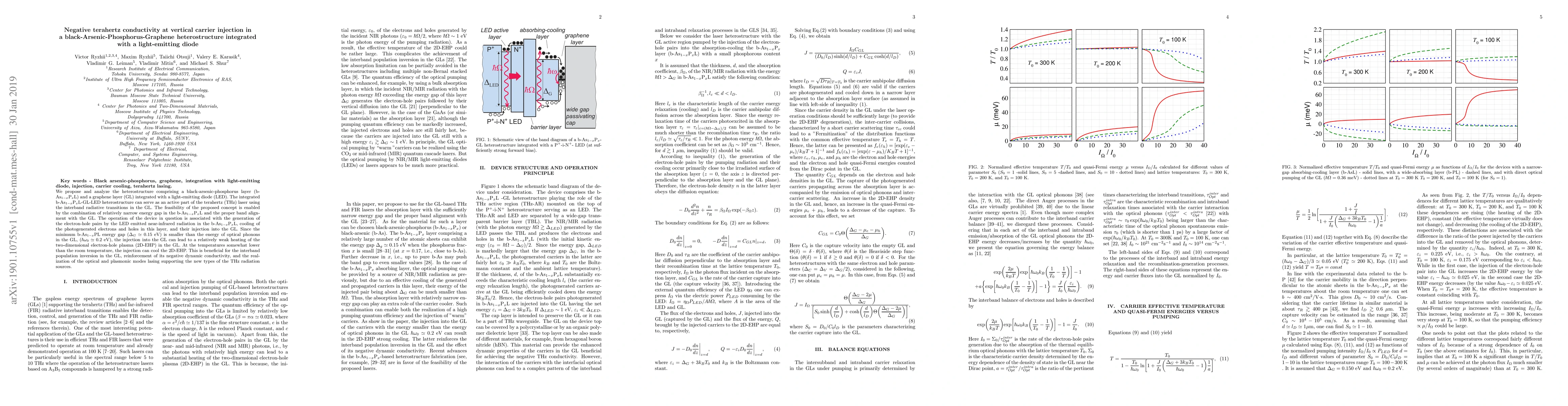 We propose and analyze the heterostructure comprising a black-arsenic-phosphorus layer (b-As$_{1-x}$P$_x$L) and a graphene layer (GL) integrated with a light-emitting diode (LED). The integrated b-As$_{1-x}$P$_x$L-GL-LED heterostructure can serve as an active part of the terahertz (THz) laser using the interband radiative transitions in the GL. The feasibility of the proposed concept is enabled by the combination of relatively narrow energy gap in the b-As$_{1-x}$P$_x$L and the proper band alignment with the GL. The operation of the device in question is associated with the generation of the electron-hole pairs by the LED emitted near-infrared radiation in the b-As$_{1-x}$P$_x$L, cooling of the photogenerated electrons and holes in this layer, and their injection into the GL. Since the minimum b-As$_{1-x}$PL energy gap is smaller than the energy of optical phonons in the GL, , the injection into the GL can lead to a relatively weak heating of the two-dimensional electron-hole plasma (2D-EHP) in the GL. At the temperatures somewhat lower than the room temperature, the injection can cool the 2D-EHP. This is beneficial for the interband population inversion in the GL, reinforcement of its negative dynamic conductivity, %in the THz range and the realization of the optical and plasmonic modes lasing supporting the new types of the THz radiation sources.