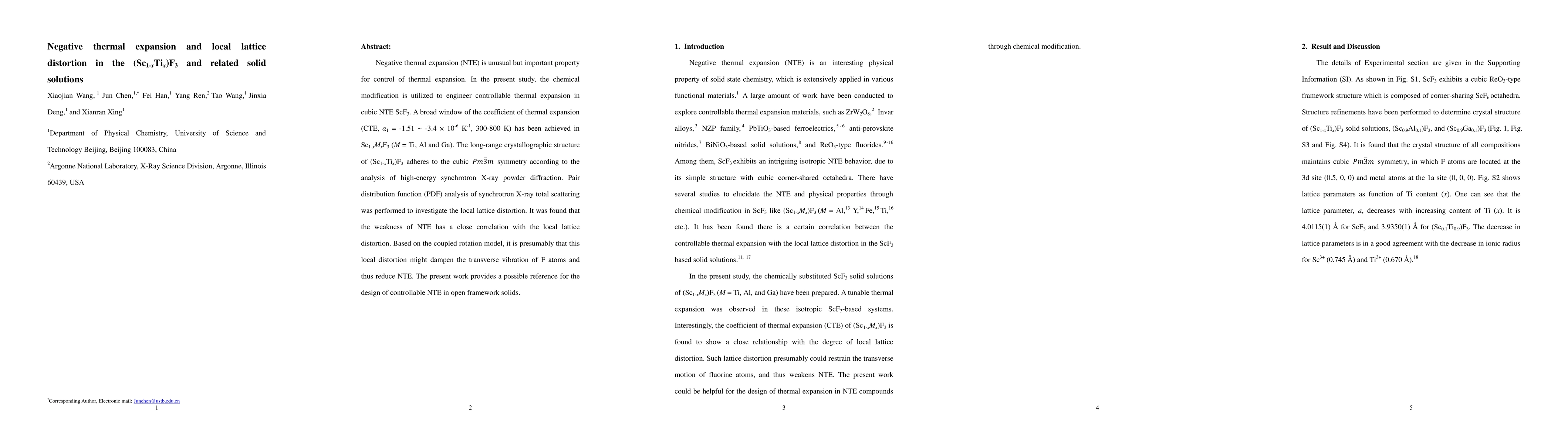 This study investigates controllable negative thermal expansion (NTE) in ScF3 by doping with Ti, Al, and Ga, achieving a broad CTE range. Local lattice distortion, observed via synchrotron X-ray total scattering, correlates with the weakening of NTE, suggesting that local distortions dampen F atom vibrations, offering insights for designing materials with tunable thermal expansion.