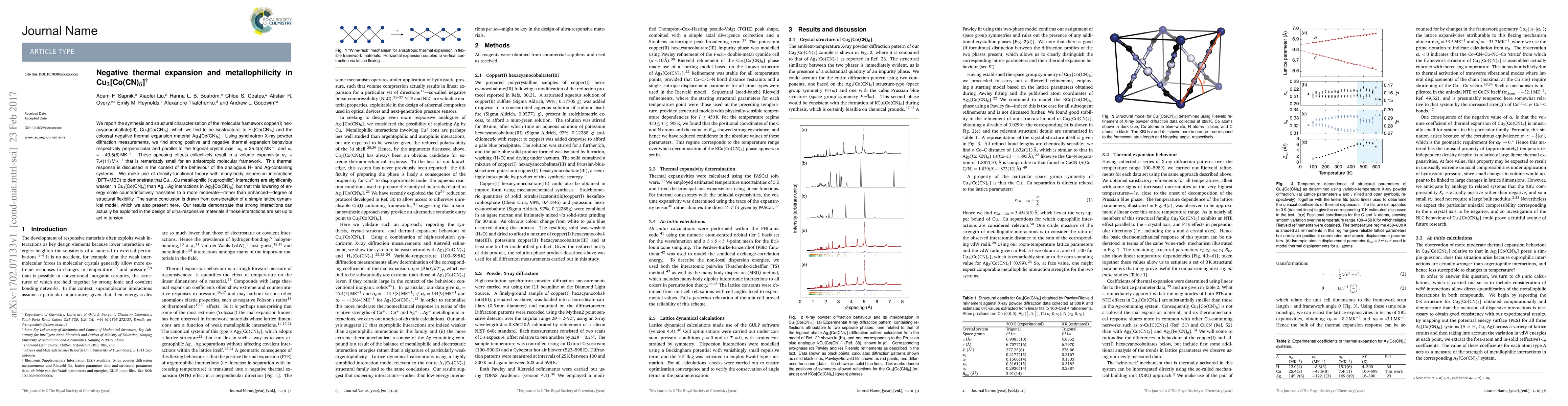 This paper reports the synthesis and structural characterization of Cu$_3$[Co(CN)$_6$], revealing a unique combination of negative thermal expansion and metallophilicity. The material exhibits anisotropic thermal expansion, with significant opposing effects resulting in a small overall volume expansivity.