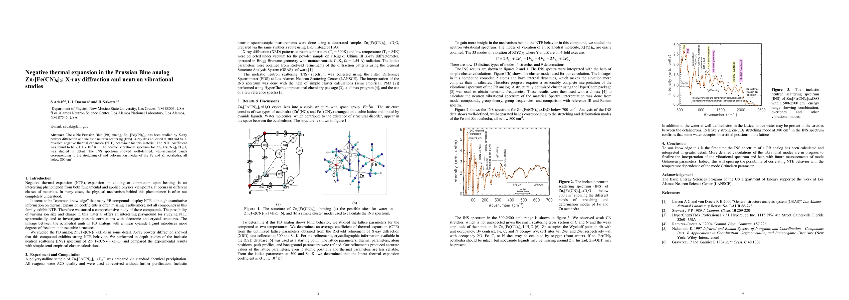 The cubic Prussian Blue (PB) analog, Zn3 [Fe(CN)6]2, has been studied by X-ray powder diffraction and inelastic neutron scattering (INS). X-ray data collected at 300 and 84 K revealed negative thermal expansion (NTE) behaviour for this material. The NTE coefficient was found to be -31.1 x 10-6 K-1. The neutron vibrational spectrum for Zn3[Fe(CN)6]2.xH2O, was studied in detail. The INS spectrum showed well-defined, well-separated bands corresponding to the stretching of and deformation modes of the Fe and Zn octahedra, all below 800 cm-1.