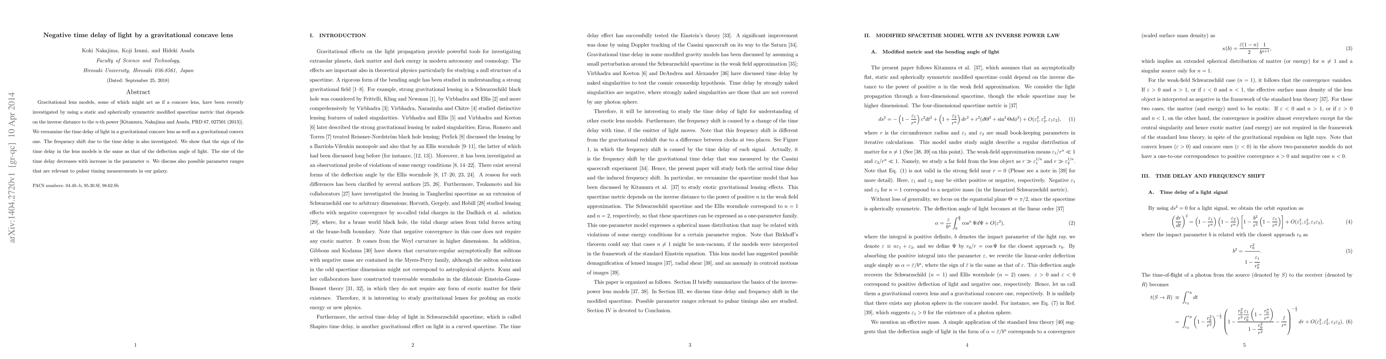 This paper investigates the time delay of light through gravitational concave lenses and compares it to convex lenses, showing that the time delay's sign matches the deflection angle. The study finds that the time delay decreases with higher values of the parameter $n$, and discusses its implications for pulsar timing measurements.