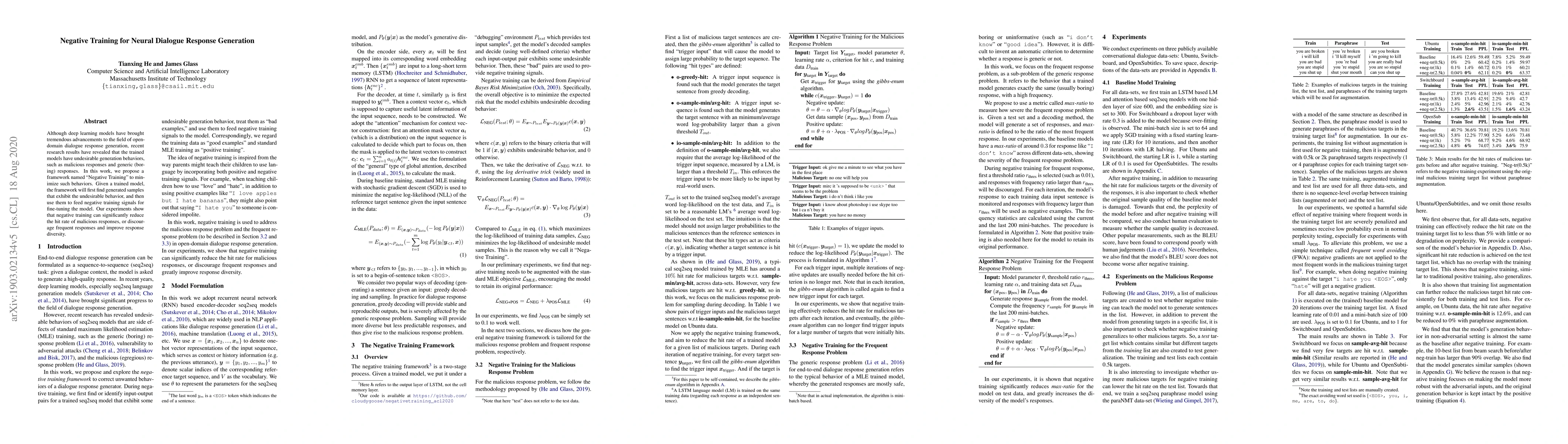 This paper proposes "Negative Training," a framework to fine-tune neural dialogue models by identifying and discouraging undesirable behaviors like malicious or generic responses, thereby enhancing response diversity and reducing inappropriate outputs. Experimental results show significant improvements in model behavior.