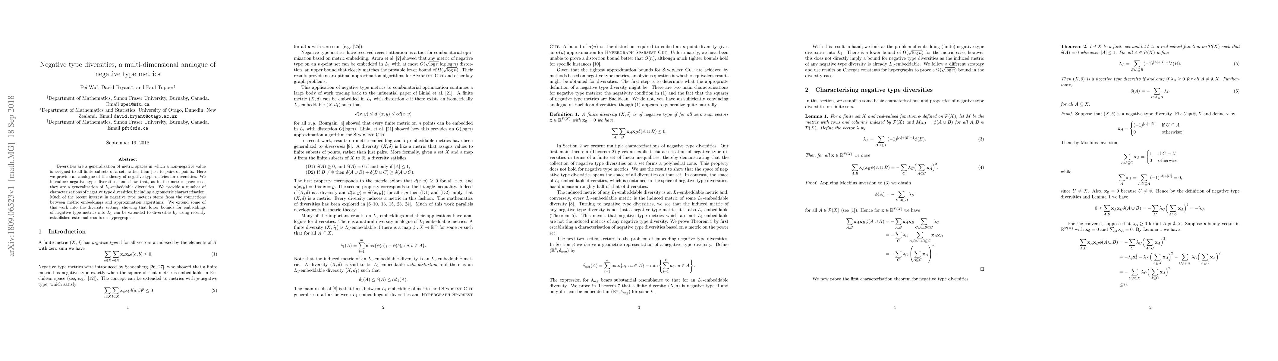 This research paper introduces negative type diversities as a generalization of metric spaces, showing they can embed $L_1$-diverse sets with lower bounds similar to those for negative type metrics in the metric space setting.
