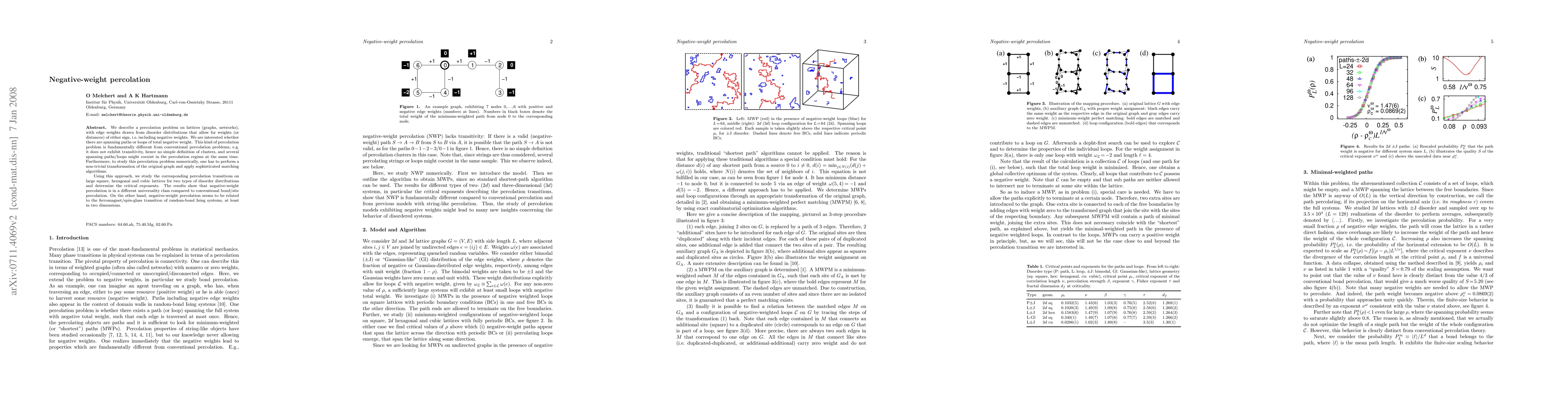 This paper investigates percolation on lattices with edge weights that can be negative, focusing on the existence of spanning paths or loops with total negative weight. It finds that this type of percolation differs fundamentally from conventional percolation, lacks transitivity, and requires complex transformations and algorithms for numerical study. The study reveals distinct critical exponents and a different universality class compared to traditional percolation, suggesting a connection to the ferromagnet/spin-glass transition in two dimensions.