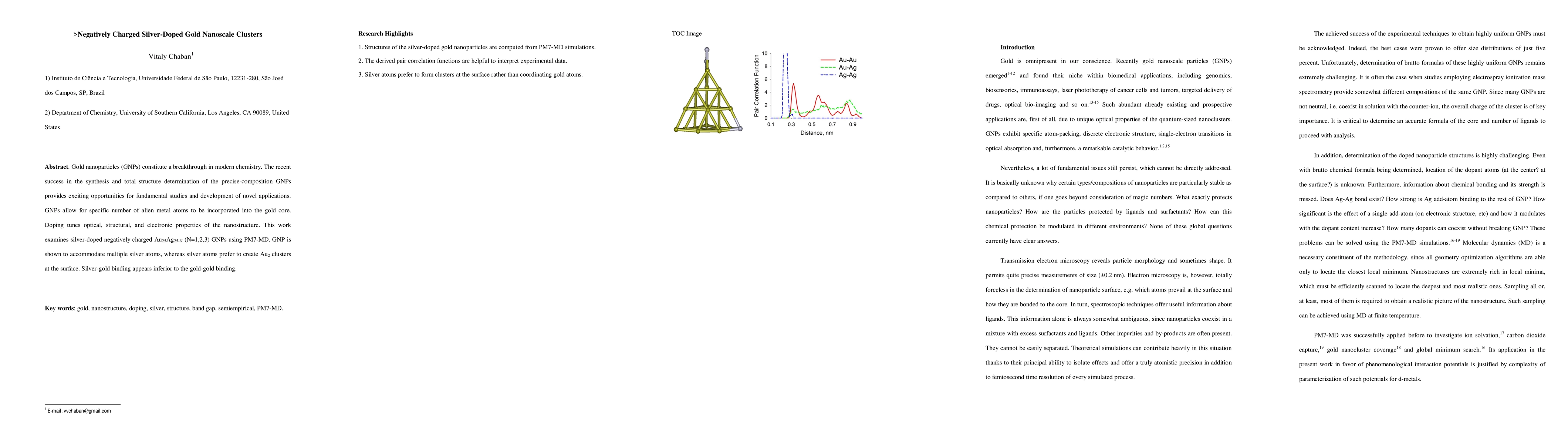 Gold nanoparticles (GNPs) constitute a breakthrough in modern chemistry. The recent success in the synthesis and total structure determination of the precise-composition GNPs provides exciting opportunities for fundamental studies and development of novel applications. GNPs allow for specific number of alien metal atoms to be incorporated into the gold core. Doping tunes optical, structural, and electronic properties of the nanostructure. This work examines silver-doped negatively charged Au25Ag25-N (N=1,2,3) GNPs using PM7-MD. GNP is shown to accommodate multiple silver atoms, whereas silver atoms prefer to create Au2 clusters at the surface. Silver-gold binding appears inferior to the gold-gold binding.