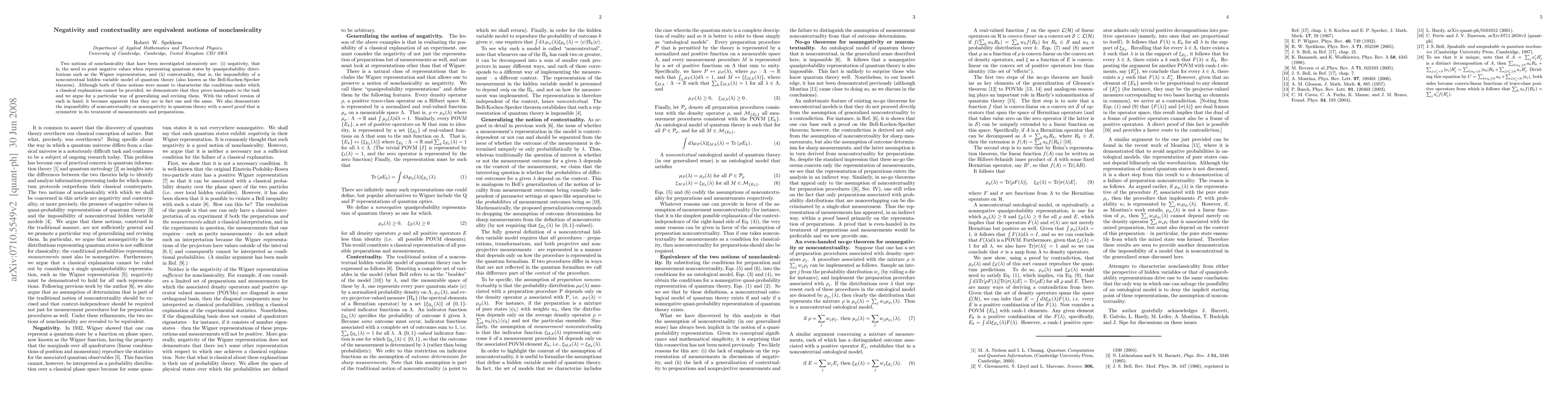 This paper argues that the concepts of negativity in quantum states and contextuality are equivalent notions of nonclassicality. It presents a novel proof showing that both cannot exist noncontextually in quantum theory, thereby unifying these two previously distinct ideas.
