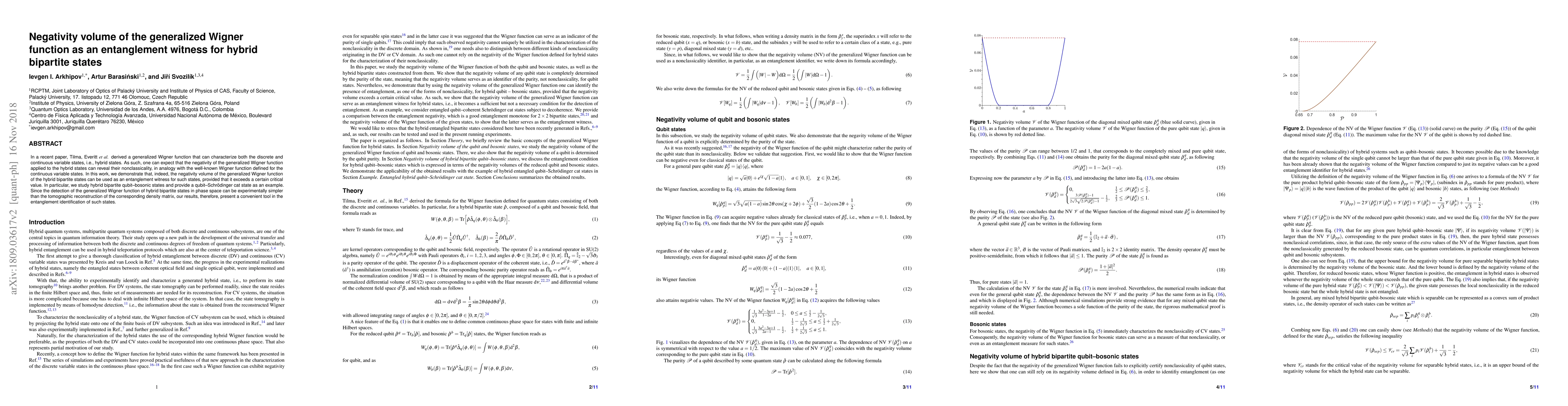 This paper demonstrates that the negativity volume of the generalized Wigner function can serve as an entanglement witness for hybrid bipartite states, showing that it can detect nonclassicality when it exceeds a critical threshold. The study focuses on qubit-bosonic states and highlights the experimental simplicity of using this method compared to traditional density matrix tomography.