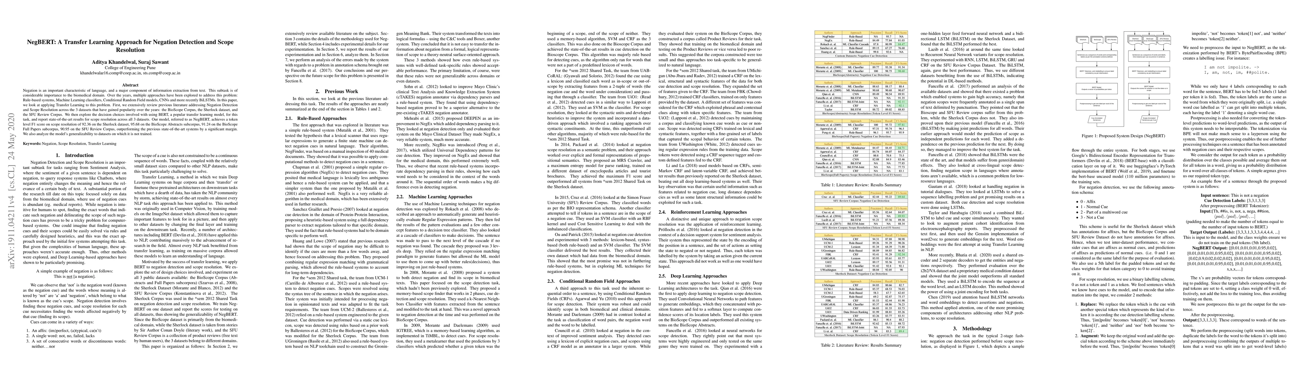 The paper presents NegBERT, a transfer learning model based on BERT for negation cue detection and scope resolution, which significantly outperforms existing systems on multiple benchmark datasets.
