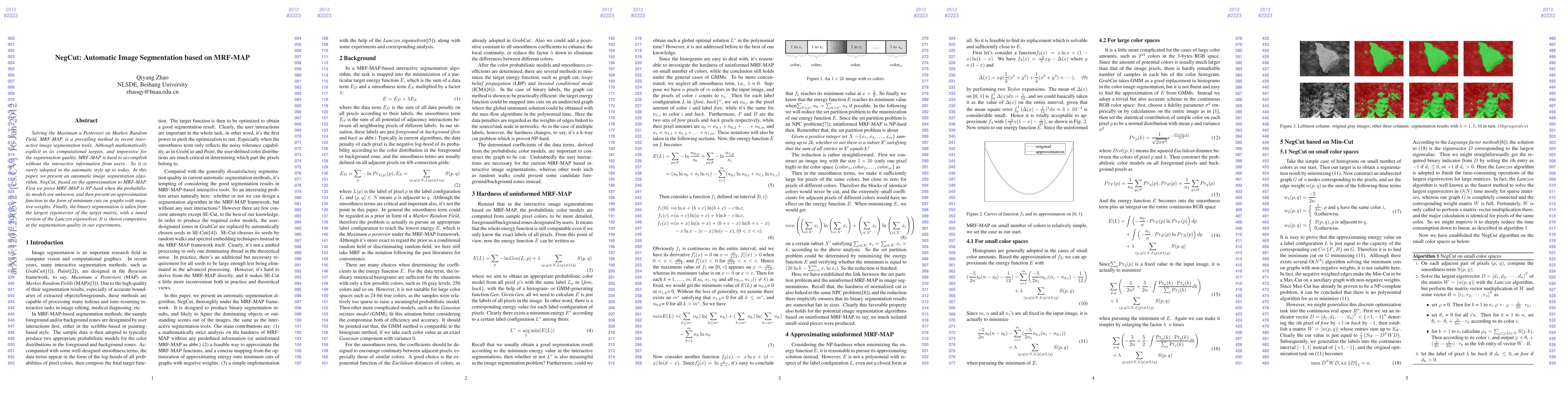Solving the Maximum a Posteriori on Markov Random Field, MRF-MAP, is a prevailing method in recent interactive image segmentation tools. Although mathematically explicit in its computational targets, and impressive for the segmentation quality, MRF-MAP is hard to accomplish without the interactive information from users. So it is rarely adopted in the automatic style up to today. In this paper, we present an automatic image segmentation algorithm, NegCut, based on the approximation to MRF-MAP. First we prove MRF-MAP is NP-hard when the probabilistic models are unknown, and then present an approximation function in the form of minimum cuts on graphs with negative weights. Finally, the binary segmentation is taken from the largest eigenvector of the target matrix, with a tuned version of the Lanczos eigensolver. It is shown competitive at the segmentation quality in our experiments.