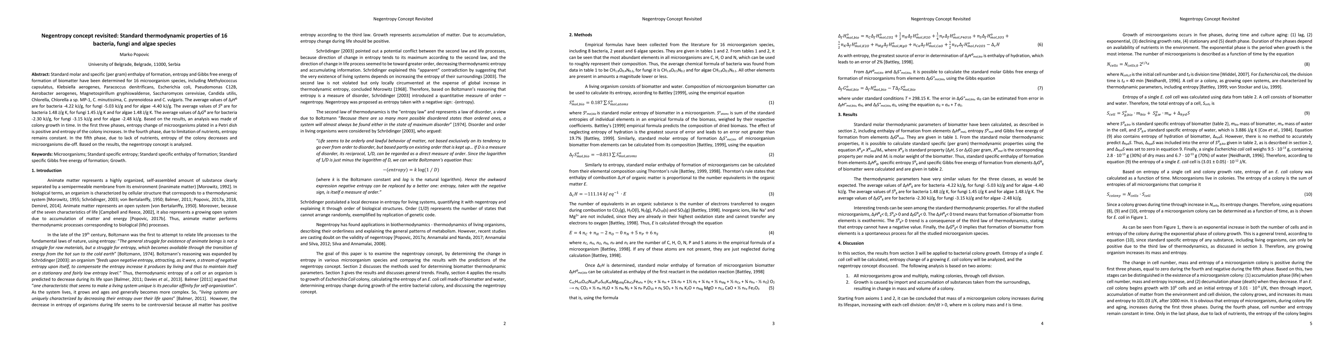 This paper determines standard thermodynamic properties of 16 microorganisms, including bacteria, fungi, and algae, and analyzes their colony growth phases in relation to negentropy. The study finds that entropy increases during initial growth phases but decreases as nutrients deplete, leading to microorganism death.
