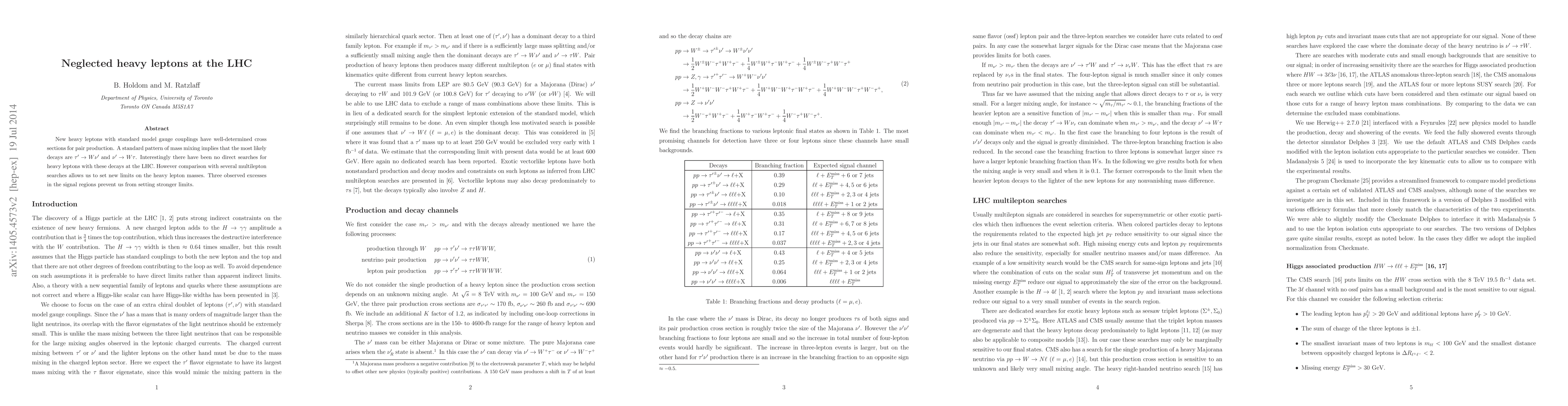 New heavy leptons with standard model gauge couplings have well determined cross sections for pair production. A standard pattern of mass mixing implies that the most likely decays are $\tau^\prime\to W \nu'$ and $ \nu'\to W \tau$. Interestingly there have been no direct searches for heavy leptons with these decays at the LHC. However comparison with several multi-lepton searches allow us to set new limits on the heavy lepton masses. Three observed excesses in the signal regions prevent us from setting stronger limits.
