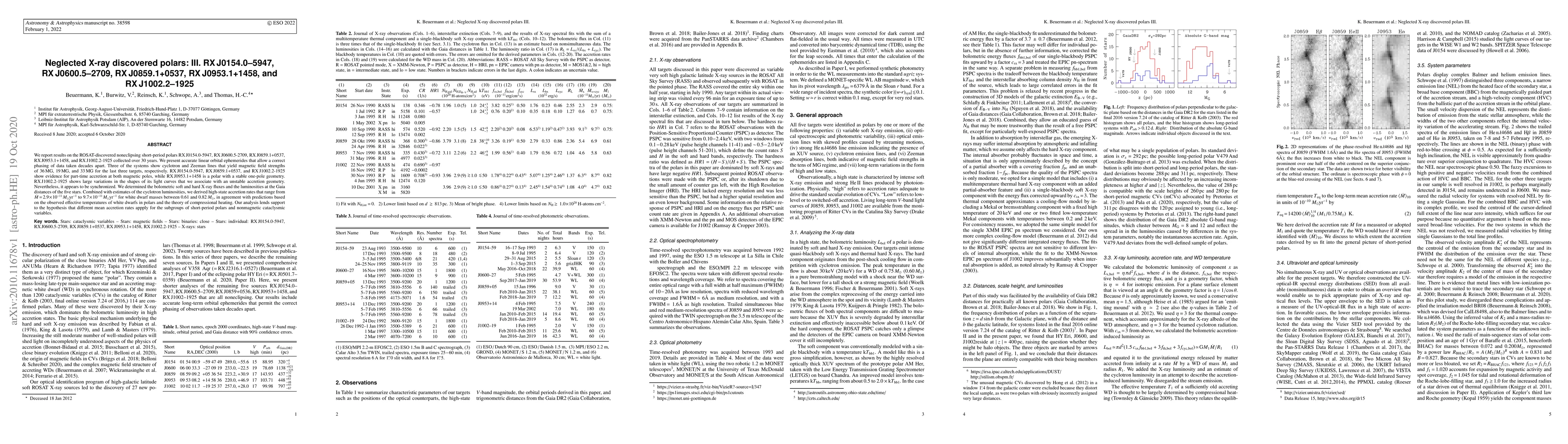 We report results on the ROSAT-discovered noneclipsing short-period polars RX J0154.0-5947, RX J0600.5-2709, RX J0859.1+0537, RX J0953.1+1458, and RX J1002.2-1925 collected over 30 years. We present accurate linear orbital ephemerides that allow a correct phasing of data taken decades apart. Three of the systems show cyclotron and Zeeman lines that yield magnetic field strengths of 36 MG, 19 MG, and 33 MG for the last three targets, respectively. RX J0154.0-5947, RX J0859.1+0537, and RX J1002.2-1925 show evidence for part-time accretion at both magnetic poles, while RX J0953.1+1458 is a polar with a stable one-pole geometry. RX J1002.2-1925 shows large variations in the shapes of its light curves that we associate with an unstable accretion geometry. Nevertheless, it appears to be synchronized. We determined the bolometric soft and hard X-ray fluxes and the luminosities at the Gaia distances of the five stars. Combined with estimates of the cyclotron luminosities, we derived high-state accretion rates that range from $\dot M = 2.9 \times 10^{-11}$ $M_{\odot}$yr$^{-1}$ to $9.7 \times 10^{-11}$ $M_{\odot}$yr$^{-1}$ for white dwarf masses between 0.61 and 0.82 $M_\odot$, in agreement with predictions based on the observed effective temperatures of white dwarfs in polars and the theory of compressional heating. Our analysis lends support to the hypothesis that different mean accretion rates appply for the subgroups of short-period polars and nonmagnetic cataclysmic variables.