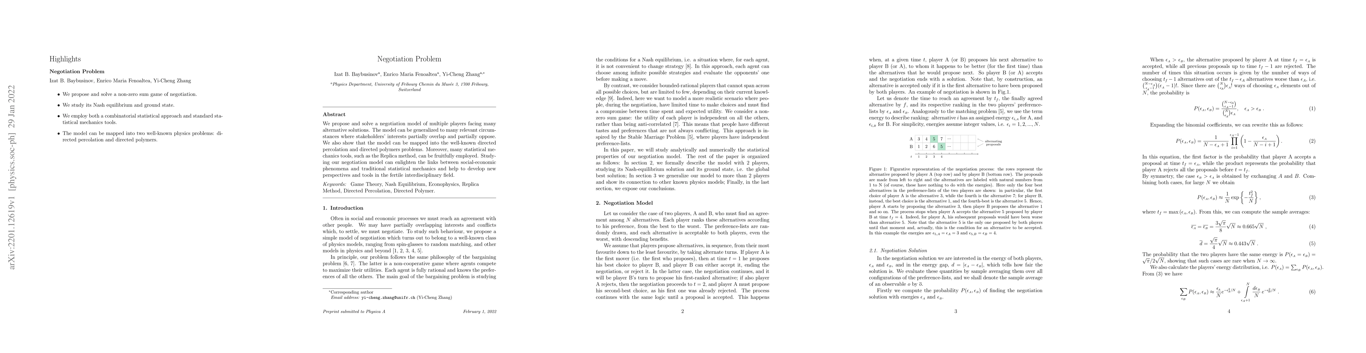 We propose and solve a negotiation model of multiple players facing many alternative solutions. The model can be generalized to many relevant circumstances where stakeholders' interests partially overlap and partially oppose. We also show that the model can be mapped into the well-known directed percolation and directed polymers problems. Moreover, many statistical mechanics tools, such as the Replica method, can be fruitfully employed. Studying our negotiation model can enlighten the links between social-economic phenomena and traditional statistical mechanics and help to develop new perspectives and tools in the fertile interdisciplinary field.